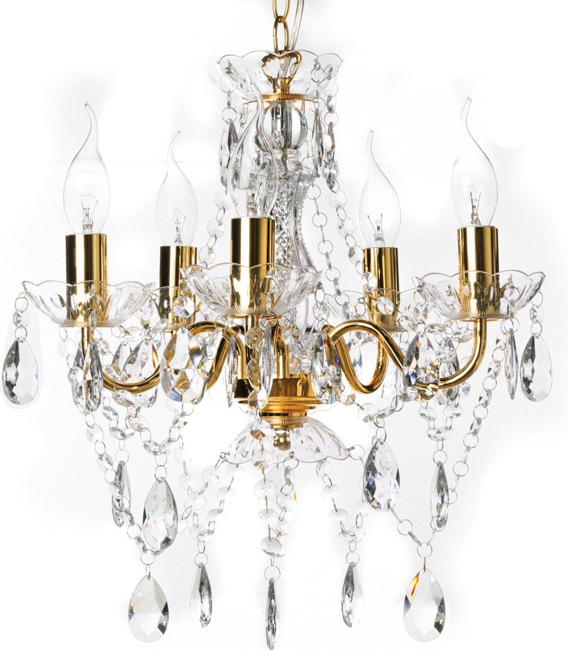 Żyrandol z kryształkami transparentno-złoty Kolor: złoty Styl: nowoczesny Żarówka w zestawie: nie Materiał: metal Rodzaj gwintu: E14 Kryształki: tak Długość kabla (cm): 75 Moc żarówki (W): 25 Wysokość (cm): 30 Ilość żarówek: 5 Średnica (cm): 40 Dostawy „Kurier – DPD” i „Kurier – DHL” obejmują …