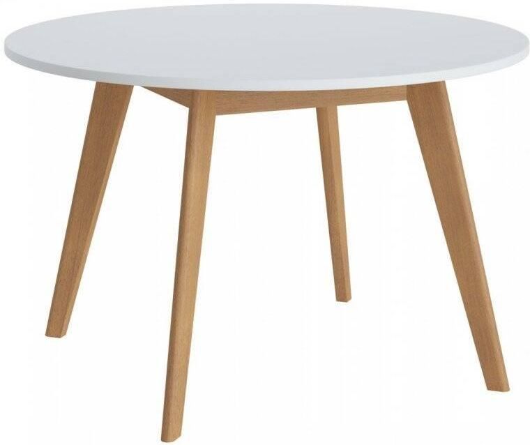 Stół MWST11 - styl skandynawski łączy biały blat z dębowymi nogami z buka, pasuje do każdego wnętrza. Trwały, okrągły i niezwykle elegancki - idealny do jadalni i salonu.
