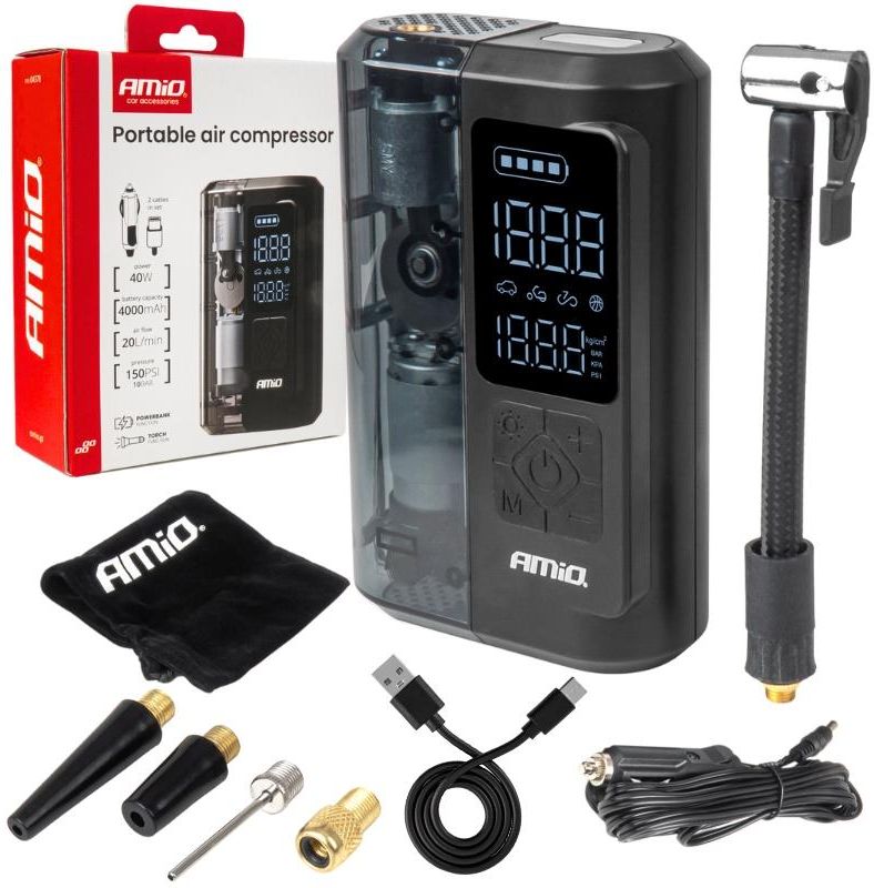 POMPKA ELEKTRYCZNA ROWEROWA KOMPRESOR SAMOCHODOWY BEZPRZEWODOWY SPRĘŻARKA Kompresor samochodowy bezprzewodowy 40W z funkcją powerbanku i latarką LED to praktyczne i kompaktowe urządzenie, które doskonale sprawdzi się podczas podróży, wakacji, biwaku czy w garażu. Dzięki możliwości pracy zarówno na akumulatorze, jak i zasilaniu 12V, jest zawsze gotowy do działania – niezależnie od sytuacji. ✔️ Ciśnienie do 10 bar / 150 PSI Wbudowana latarka LED pozwala bezpiecznie korzystać z kompresora nawet po zmroku, a cyfrowy ekran z funkcją AUTO STOP gwarantuje precyzyjne pompowanie z automatycznym wyłączeniem. Dzięki mocy 40Wi przepływowi powietrza 20L/min, urządzenie radzi sobie z oponami samochodów osobowych, motocykli, rowerów, piłkami, materacami i innymi przedmiotami. Działa bezprzewodowo (akumulator 2x2000 mAh) lub na zasilaniu 12V z zapalniczki. Indeks: ARTA1300 Producent: AMiO Co cechuje nasz produkt? Wysoka jakość wykonania oraz niska cena wyróżnia nas na tle konkurencji. Możesz być pewny, że otrzymasz towar w pełni wartościowy. Bezprzewodowy kompresor samochodowy akumulatorowy USB-C 40W to zaawansowane i praktyczne urządzenie, które sprawdzi się zarówno w codziennym użytkowaniu, jak i w sytuacjach awaryjnych. Cechy produktu ✅ Bezprzewodowy i akumulatorowy – brak kabli, pełna mobilność ✅ Moc: 40W – wydajność aż 20 l/min ✅ Zasilanie akumulatorowe lub stałe przy pomocy dołączonego przewodu do gniazda zapalniczki 12V o długości 3 metrów ✅ Akumulator 2 × 2000 mAh – długi czas pracy na jednym ładowaniu ✅ Maksymalne ciśnienie 10 bar (150 PSI) – idealny do opon samochodowych, motocyklowych, rowerowych ✅ Cyfrowy wyświetlacz LED – dokładne ustawienie i odczyt ciśnienia ✅ Funkcja AUTO STOP – automatyczne zatrzymanie po osiągnięciu ustawionego ciśnienia ✅ Powerbank (USB-A) – naładuj telefon lub inne urządzenia mobilne w podróży Wyposażony w czytelny cyfrowy wyświetlacz LED, pozwala precyzyjnie ustawić żądane ciśnienie, a funkcja Auto Stop zatrzymuje pompowanie dokładnie po osiągnięciu wybranego poziomu – bez ryzyka przeładowania. Dzięki pojemnemu akumulatorowi 2 × 2000 mAh, urządzenie może działać bez przerwy nawet przez kilkadziesiąt minut, a możliwość ładowania przez USB-C zapewnia szybkie uzupełnienie energii. Kompresor posiada również port USB-A, dzięki czemu może pełnić rolę awaryjnego powerbanku – idealne w trasie! Wbudowana latarka LED przydaje się przy nocnym pompowaniu lub awarii na poboczu. Dodatkowe końcówki pozwalają na pompowanie niemal wszystkiego – od opon i dętek po piłki, materace i zabawki. Link do prezentacji produktu: https://youtu.be/Y7uz5F3II9I?si=wC8uxaOFFEVqxh-p