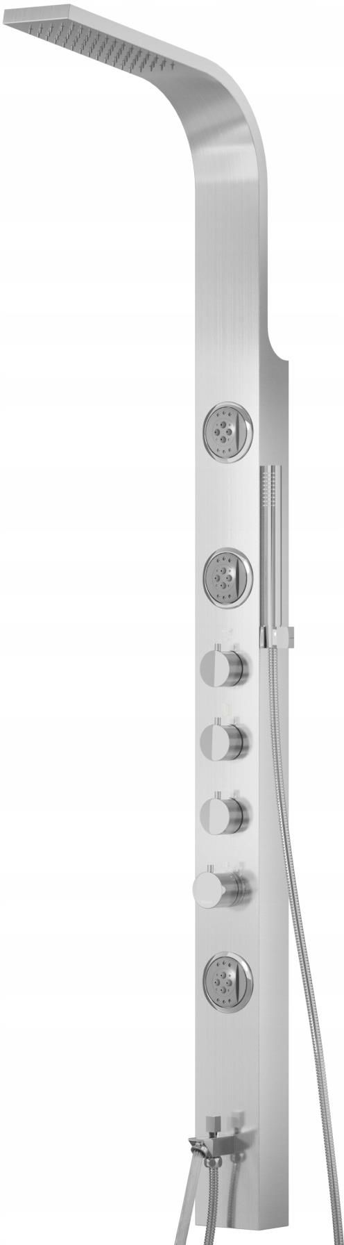 PANEL PRYSZNICOWY CORSAN SNAKE STALOWY TERMOSTAT z wylewką STAL NIERDZEWNA - W panelu SNAKE stal jest szczotkowana. Technika ta pozwala na utrzymanie panela w czystości (nie widać kropel wody ani odcisków palców). Panel prysznicowy ma kształt wyoblany - uformowane aluminium. Przez to panel nigdy nie będzie przeciekał (nie ma doklejanych boków). CHROMOWANE WYKOŃCZENIA - daje lśniący połysk i dzięki wysokiej zawartości chromu panel jest odporny na wysokie temperatury. Efektowne chromowane wykończenia (pokrętła, prysznic ręczny, uchwyty) podkreślają i wzbogacają panel. Wysoka jakość dysz to podstawa komfortu podczas użytkowania panela. Deszczownica uformowana od lekkim kątem, żeby "nie przyklejać się" do panela. Posiada 65 punktów natrysku. Wszystkie dysze wykończone sa systemem ANTI- CALC (silikonowe gumki, przez które kamień przepływa nie osadzając się wewnątrz panela - tym samym przedłużając jego trwałość i niezawodność). Deszczownice włącza się za pomocą pierwszego pokrętła na panelu. Pokrętłem reguluje się również ciśnienie wody - od lekkiego deszczyku po mocny strumień. Mamy trzy punkty dysz hydromasażu osadzone w panelu: Wszystkie posiadają system ANTI-CALC. Ciśnienie wody można zwiększać za pomocą pokręteł mieszaczy wody. Możemy zmienić strumień wody: układ poziomy: funkcja rosa układ pionowy: bicz wodny Oszczędność wody! Dzięki zastosowaniu nowoczesnej technologii woda w panelu rozbijana jest na nitkowe dysze, dzięki czemu zwiększa ciśnienie wody umożliwiając nam korzystanie z porządnego masażu. Dzięki temu zabiegowi panel można stosować w mieszkaniach gdzie jest przeciętne ciśnienie wody. Słuchawka prysznica ręcznego zrobiona jest ze stali! W większości przypadków na rynku, maja Państwo chromowany plastik. Prysznic ręczny jest umiejscowiony na wysokości środka panela, żeby wąż nie przeszkadzał leżąc w wannie. Słuchawka jest jednofunkcyjna wykończona systemem ANTI-CALC. Uchwyt słuchawki przystosowany jest zarówno do montażu naściennego jak i narożnego. UWAGA: MOŻLIWY MONTAŻ NAROŻNY LUB NAŚCIENNY - WYSTARCZY POWIADMOIĆ NAS O RODZAJU MONTAŻU A UCHWYTY DOŁOŻYMY GRATIS! Pokrętła na panelu są ceramiczne oraz mają tzw. zaworki samo kontrujące (zapobiegające samoczynnemu przeciskaniu się wody pod wpływem ciśnienia). Wszystkie pokrętła mają wkład ceramiczny. 1. Pokrętło - włączenie i ciśnienie wody deszczownicy; 2. Pokrętło - włączenie i ciśnienie wody w hydromasażu; 3. Pokrętło - włączenie i ciśnienie wody prysznica ręcznego. Pokrętła są na stalowym podkładzie, na którym czytelnie narysowana jest opcja. WAŻNE! Panel ma za zadanie dostarczyć w jednym czasie wodę z wielu źródeł. . Przy zastosowanym jednym pokrętle strumienia wody w panelu nie możemy jednocześnie korzystać ze wszystkich opcji, gdyż przekręcając pokrętłem zamykamy jeden strumień przechodząc na drugi. Dlatego ważne aby każda opcja strumienia wody miała swoje pokrętło. Wtedy np. aby skorzystać w razie potrzeby z prysznica ręcznego nie wyłączy nam się automatycznie hydromasaż. Pokrętło ze stali chromowanej. Jest to ostatni mieszacz na panelu (nieco wysunięty do przodu). Bateria termostatyczna powoduje dokładne ustawienie temperatury wody. Przy 38 stopniach dodatkowy ogranicznik (przeciw oparzeniowy), po jego wciśnięciu można ustawić wyższa temperaturę. Dane techniczne WYSOKOŚĆ - 1650 mm; SZEROKOŚĆ - 110 mm; WYSIĘG DESZCZOWNICY - 500 mm; odległość od ściany- 70 mm; WĄŻ - 1500 mm Zdjęcia