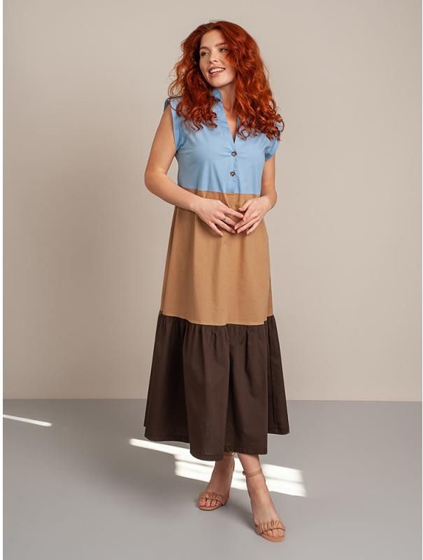 Długa sukienka w trzech kolorach: brązowym, camelowym i błękitnym, z odkrytymi ramionami, zapinana na guziki