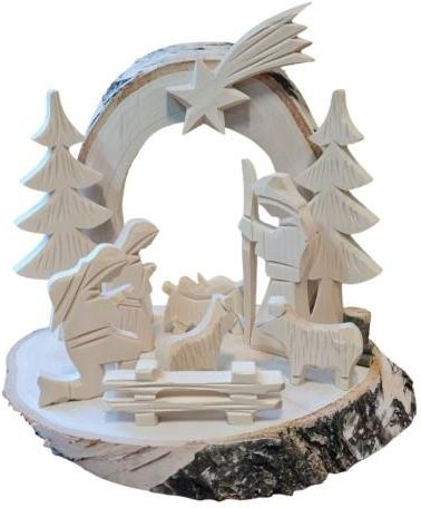 Ludowa szopka z brzozy Tradycyjna ręcznie wykonana ludowa szopka. Wykonana przez artystę ludowego ze Stryszawy - słynnego centrum zabawkarstwa i rękodzieła. W szopce znajdują się figurki: Maryja, Józef, pastuszek, dwie owieczki oraz żłóbek. Podstawa wykonana z plastrów brzozy. Figurki wykonane z drewna lipowego. Wymiary całości kompozycji: wysokość: ok. 21 cm szerokość: ok. 26 cm