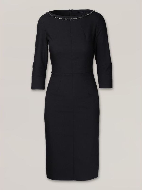 Elegancka dopasowana sukienka Midi ze zdobieniami Mocno dopasowana sukienka Midi podkreślająca figurę z rękawami 3/4. Lekko rozciągliwa tkanina z dodatkiem elastanu. Posiada zdobienia pod szyją. Kolor główny: czarny Długość rękawów: 3/4 Rodzaj sukienki: mocno dopasowana, długość MIDI Skład: 57% wiskoza, 40% poliester, 3% elastan Wyprodukowano w Polsce Gwarancja: 24 m-ce
