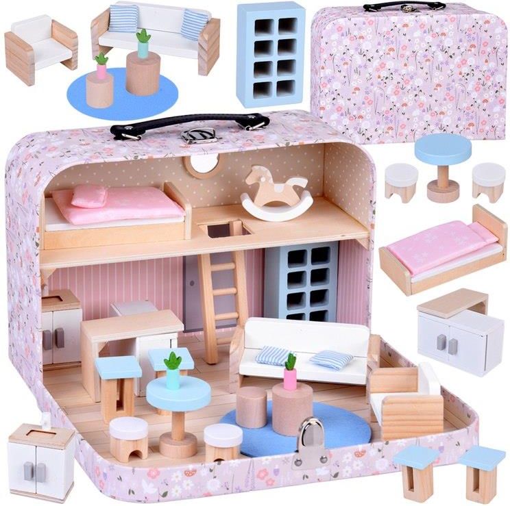 Domek w walizce z drewnianymi mebelkami Domek w walizce z drewnianymi mebelkami to prawdziwa perełka wśród zabawek - maleńki, magiczny świat zamknięty w uroczej, kwiecistej walizeczce, która już od pierwszego spojrzenia zaprasza do odkrywania swoich tajemnic. To zestaw pełen ciepła, detali i …