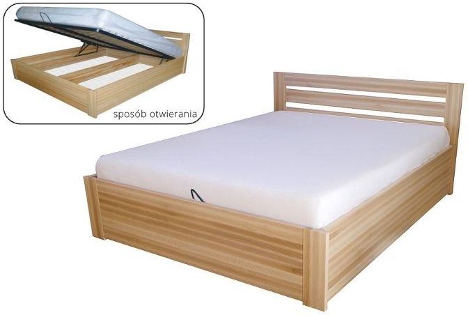 Łóżko bukowe Tapczan 140x200 Łóżka, tapczany drewniane wykonane w całości z drewna bukowego. Jedynie na dnie łóżka znajduje się płyta pilśniowa. Konstrukcja jest bardzo solidna i trwała. Grubość elementów wynosi 30mm! Do zestawu dołączany jest stelaż na metalowej ramie o wysokości 4cm podnoszony na podnośnikach gazowych. Stelaż wyposażony jest w 34(17 po prawej i 17 po lewej stronie) bukowe listwy sprężynujące, klejone warstwowo, dzięki którym materac lepiej dostosowuje się do kształtu ciała. Łóżko jest funkcjonalne, idealnie sprawdzi się w sytuacji, gdy chcemy zaoszczędzić miejsce, posiada bowiem miejsce do przechowywania. Po uniesieniu stelaża widoczne jest miejsce na pościel. Wymiary łóżka : szerokość wewnętrzna 140 cm długość wewnętrzna 200 cm wysokość łóżka przy głowie 90 cm wysokość łóżka przy nogach 42 cm wymiar nóg 15x3 cm