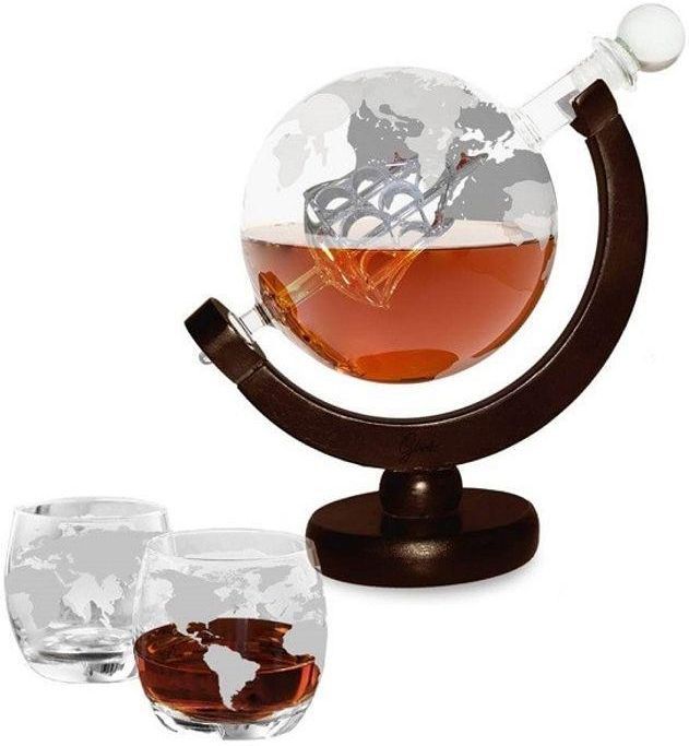 ✅Karafka w formie globusa z makietą żaglowca w środku ✅Zestaw zawiera dodatkowo 2 szklanki z mapą świata ✅W zestawie znajdziesz również kamienne kostki do whisky, szczypce do lodu oraz lejek ✅Materiał: szkło, drewno, metal, kamień ✅Pojemność: 850ml ✅Wysokość: 21cm ✅Eleganckie i bardzo bezpieczne opakowanie ✅Idealna na prezent ✅Ręcznie dmuchane szkło ✅Karafką można obracać jak prawdziwym globusem KARAFKA DO WHISKY GLOBUS ZESTAW SZKLANKI DO WHISKY Karafka Globus w zestawie z 2 stylowymi szklaneczkami to rewelacyjny pomysł na prezent. Na karafce i na szklanych znajduje się naniesiona mapa a w środku karafki umieszczona jest miniatura okrętu. Do karafki mieści się 850ml trunku, który jest chroniony dzięki szczelnemu korkowi. Drewniana podstawa dopełnia Karafka ma pojemność aż 850ml, możesz jej więc używać również do słabszych alkoholi, np. porto, nalewki czy wino. Dołączony korek bardzo dobrze zabezpiecza karafkę przed dostępem powietrza, dzięki czemu zawartość pozostanie dłużej świeża i pełna aromatów. Karafka Globus wraz z 2 szklaneczkami jest zapakowana w bardzo eleganckie, prezentowe pudełko. Taki prezent nie może się nie spodobać. Karafka jest tak ładna, że robi wrażenie również, gdy jest pusta, a to naprawdę ewenement. SPECYFIKACJA: Karafka Globus ze Szklaneczkami (Globe Decanter Set) Zestaw zawiera: karafkę, kostki do chłodzenia, szczypce, stojak, korek oraz 2 szklanki Wymiary: 20 x 12 x 22cm Średnica każdej z szklanek: 8.5cm, wysokość: 8.5cm Pojemność karafki: 850ml Materiał: szkło borosilikatowe, drewno Bardzo eleganckie opakowanie