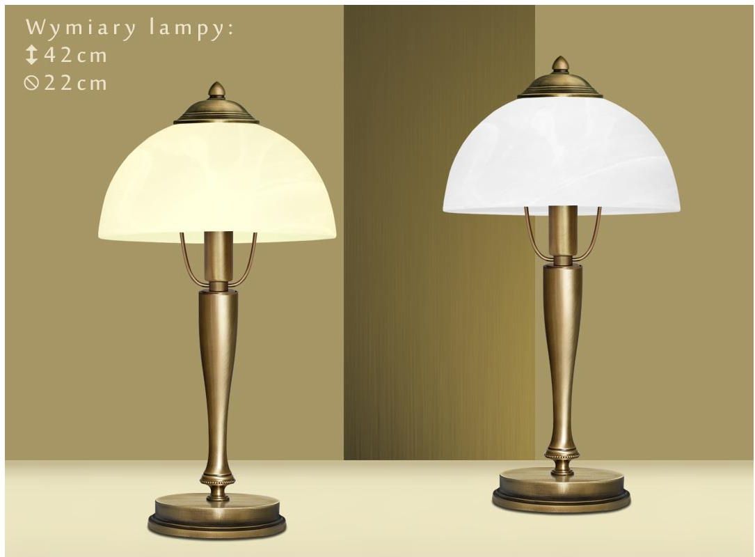 Lampa mosiężna biurkowa. - Wykonana w całości z elementów z pełnego mosiądzu. Mosiądz to trwały, szlachetny i ponadczasowy materiał - kliknij, aby dowiedzieć się więcej. - Wykończenie mosiądzu: złota patyna. - Zawiera włoskie ozdobne odlewy mosiężne. - Klosz szklany do wyboru: biały ‘alabaster’ lub ecru ‘alabaster’ (albo na zamówienie ecru gładki w zależności od dostępności). - Wymiary całkowite: wysokość 42cm, średnica klosza 22cm.- Włącznik na przewodzie zasilającym (przewód w kolorze lampy wyprowadzony jest z boku podstawy). - Żródło światła: 1xE14 (żarówka tradycyjna/żarowa o mocy max. 40W) lub żarówka energooszczędna albo LED o większej mocy (np. 60W). Lampa jest fabrycznie nowa, wyprodukowana w Polsce. Gwarancja: 24 miesiące. Seria U - zobacz wszystkie lampy