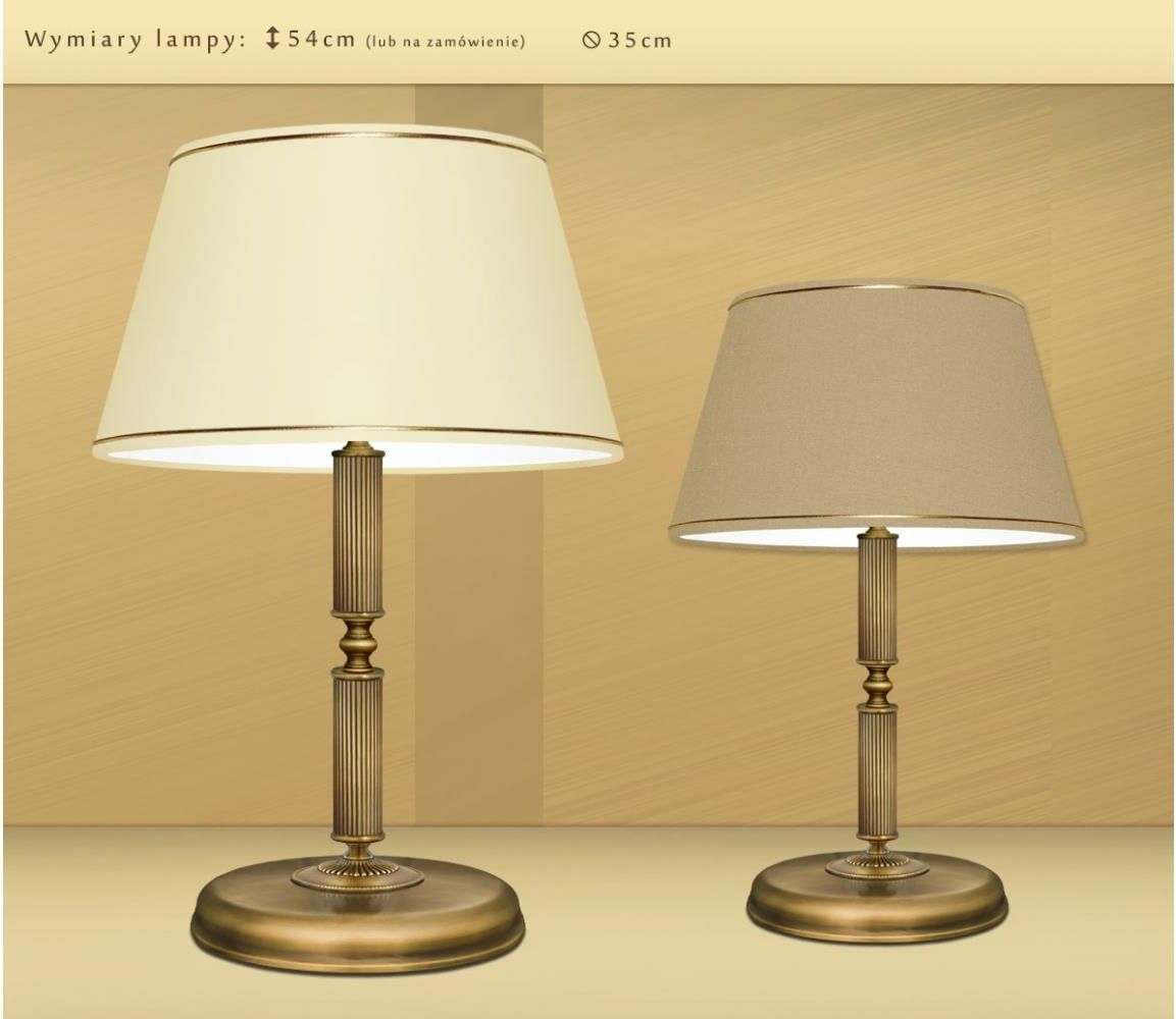 Lampa mosiężna na komodę / biurko. - Wykonana w całości z elementów z pełnego mosiądzu. Mosiądz to trwały, szlachetny i ponadczasowy materiał - kliknij, aby dowiedzieć się więcej. - Wykończenie mosiądzu: złota patyna.- W podstawie lampy umieszczony jest odważnik zapewniający jej stabilność. - Abażury do wyboru: ecru lub cappuccino zdobione wypukłymi złotymi paskami lub (symbol lampy L-B2m) ciemny brąz ze złotym środkiem. - Wymiary całkowite: wysokość 54cm, średnica abażura 35cm, wysokość abażura 21cm.- W podstawie lampy umieszczony jest odważnik zapewniający jej stabilność.- Włącznik na przewodzie zasilającym (przewód w kolorze lampy wyprowadzony jest z boku podstawy). - Żródło światła: 2xE27 (żarówki tradycyjne/żarowe o mocy max. 60W) lub żarówki energooszczędne albo LED o większej mocy (np. odpowiednik 100W). Lampa jest fabrycznie nowa, wyprodukowana w Polsce. Gwarancja: 24 miesiące. Seria L - zobacz wszystkie lampy
