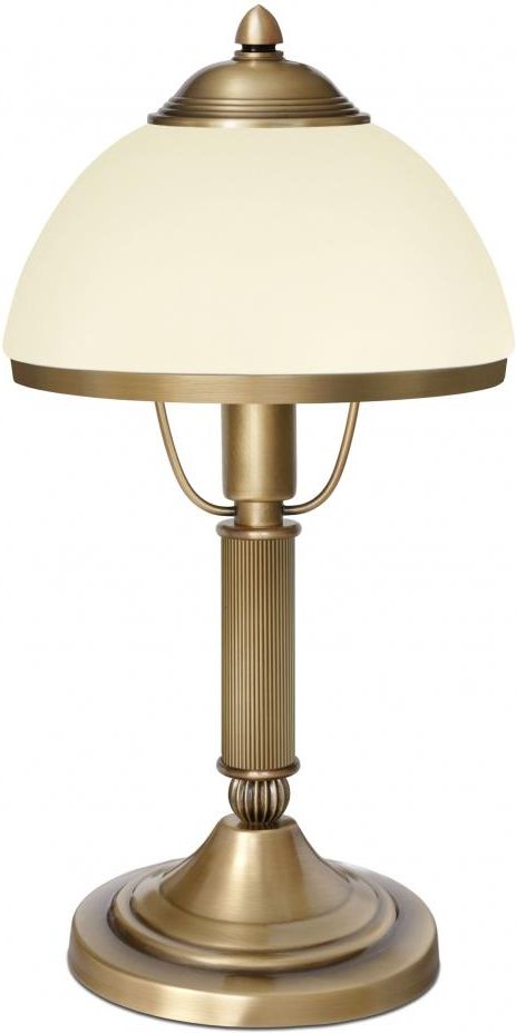 Lampa mosiężna biurkowa / stołowa. - Wykonana w całości z elementów z pełnego mosiądzu. Mosiądz to trwały, szlachetny i ponadczasowy materiał - kliknij, aby dowiedzieć się więcej. - Wykończenie mosiądzu: złota patyna. - Zawiera włoski ozdobny odlew mosiężny. - Klosz szklany kremowy matowy lub biały matowy z ramką mosiężną (albo klosz biały połysk w niżej cenie - zobacz inne lampy z serii HR). - Wymiary całkowite: wysokość 40cm, średnica klosza 19cm. - W podstawie lampy umieszczony jest odważnik zapewniający jej stabilność.- Włącznik na przewodzie zasilającym (przewód w kolorze lampy wyprowadzony jest z boku podstawy). - Żródło światła: 1xE14 (żarówka tradycyjna/żarowa o mocy max. 40W) lub żarówka energooszczędna albo LED o większej mocy (np. 80W). Lampa jest fabrycznie nowa, wyprodukowana w Polsce. Gwarancja: 24 miesiące. Seria HR - zobacz wszystkie lampy