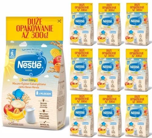 NESTLE Kaszka mleczno-ryżowa Jabłko Banan Morela po 9 miesiącu 10x300g Ze względu na zmianę opakowań przez producenta NESTLE gramatura kaszek wynosi 300g. Kaszka mleczno-ryżowa Nestlé to pyszny smak jabłka banana i moreli. Jest to środek spożywczy specjalnego przeznaczenia żywieniowego. Kaszka to doskonały sposób na urozmaicenie diety malucha po 9 miesiącu życia. Kaszka wyprodukowana jest z wysokiej jakości ryżu pochodzącego z kontrolowanych upraw. Kaszka mleczno-ryżowa o smaku jabłka, banana i moreli to pełnowartościowy, bezglutenowy posiłek. Dzięki zawartości mleka modyfikowanego, wystarczy dodać wodę, aby posiłek był gotowy. Zastosowanie: dla niemowląt po 9 miesiącu życia. Sposób użycia: wodę pitną doprowadź do wrzenia i gotuj przez 5 minut. Odmierz odpowiednią ilość wody (150ml) i wlej do miseczki dziecka. Temperatura wody nie może być wyższa niż 40 stopni Celsjusza. Dodaj 50g kaszki. Mieszaj do uzyskania jednolitej konsystencji. Ważne wskazówki: Produkt pakowany w atmosferze ochronnej. Przechowywać w suchym i chłodnym miejscu. Nie przechowywać resztek posiłku. Po każdym użyciu szczelnie zamkniętą torebkę przechowywać w suchym i chłodnym miejscu. Zużyć nie później niż w 3 tygodnie po otwarciu torebki. Przechowywać w sposób niedostępny dla dzieci. Może być stosowany w żywieniu dietetycznym starszych dzieci i dorosłych. Składniki: mleko modyfikowane 33,4% [odtłuszczone mleko w proszku, oleje roślinne (olej słonecznikowy, olej rzepakowy), mąka ryżowa 27,2%, mąka kukurydziana 18,6%, cukier, maltodekstryna, płatki jabłka 3% (jabłko, skrobia kukurydziana, maltodekstryna, emulgator: lecytyny), płatki banana 2,5%, proszek moreli 1,5%, składniki mineralne (węglan wapnia, fumaran żelaza (II), siarczan cynku, jodek potasu), naturalny aromat jabłkowy, witaminy (C, niacyna, E, B1, kwas pantotenowy, A, B6, K, kwas foliowy, biotyna, D), kultury bakterii Bifidobacterium lactis. Nie zawiera : Zboża zawierające gluten Zawiera : Mleko Zawartość netto: 10x300g