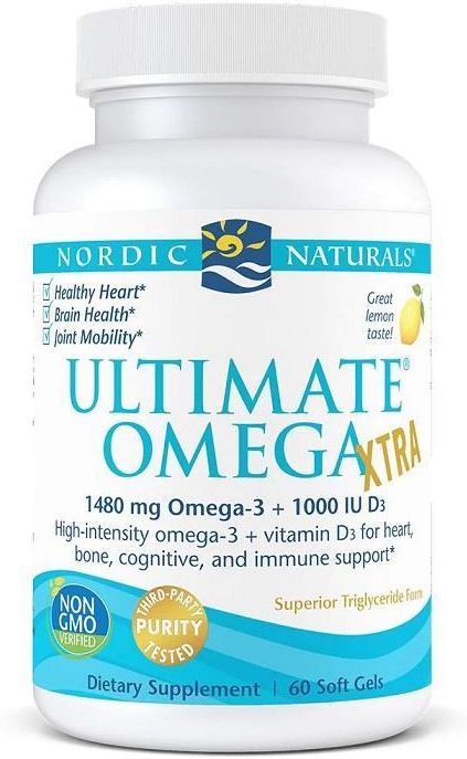 NORDIC NATURALS Ultimate Omega Xtra to suplement diety z wysoką zawartością Omega-3 (1480 mg), EPA 850 mg, DHA 425 mg i witaminą D3 25 mcg. 🦠 Bogate źródło Omega-3 1480 mg w porcji - EPA 850 mg i DHA 425 mg, suplement diety omega-3 dla serca, mózgu i oczu, Ultimate Omega Xtra. ⚡ Witamina D3 25 mcg w oliwie z oliwek oraz naturalny aromat cytrynowy, zalecane 2 kapsułki dziennie, lepsza biodostępność i wygoda stosowania. 💚 Oczyszczony olej z ryb głębinowych (anchois, sardynki), bez tłuszczów trans, z d-alfa-tokoferolem i ekstraktem z rozmarynu dla stabilności i jakości produktu. NORDIC NATURALS Ultimate Omega Xtra (60 kaps.) NORDIC NATURALS Ultimate Omega Xtra 60 kaps. – zaawansowany suplement diety bogaty w kwasy tłuszczowe omega-3 (EPA i DHA) oraz witaminę D3, stworzony dla osób dbających o zdrowe serce, prawidłowe funkcjonowanie mózgu i odporność. Nordic Naturals Ultimate Omega Xtra 60 kaps. dostarcza wysoką dawkę EPA i DHA, dlatego jest idealny jako codzienny suplement omega-3 z witaminą D3. 💪 Dlaczego warto wybrać ten produkt? Wysoka zawartość EPA i DHA – 850 mg EPA i 425 mg DHA w dziennej porcji, co wspiera pracę serca, układ krążenia oraz funkcje poznawcze. Suplement omega-3 z witaminą D3 – 25 µg (1000 IU) witaminy D3 w porcji, wspomaga odporność oraz zdrowie kości i mięśni. Formuła oparta na oczyszczonym oleju z ryb głębinowych, dlatego produkt ma wysoką biodostępność, jest skuteczny i bezpieczny, jeśli stosowany zgodnie ze wskazaniami. Naturalny aromat cytrynowy oraz dodatki antyoksydacyjne (d-alfa-tokoferol, ekstrakt z rozmarynu) pomagają zachować świeżość oleju oraz neutralizują nieprzyjemny posmak. 🧪 Składniki aktywne Składnik Wartość w 2 kapsułkach Całkowita zawartość kwasów Omega-3 1480 mg EPA (kwas eikozapentaenowy) 850 mg DHA (kwas dokozaheksaenowy) 425 mg Inne omega-3 205 mg Witamina D3 (cholekalcyferol) 25 µg Kalorie 20 kcal Całkowita zawartość tłuszczu 2 g (w tym tłuszcze nasycone 0.1 g) 🧫 Skład Oczyszczony olej z ryb głębinowych (z anchois, sardynek), kapsułka: żelatyna, woda, gliceryna; dodatki: naturalny aromat cytrynowy, d-alfa-tokoferol, ekstrakt z rozmarynu oraz witamina D3 (cholekalcyferol w oliwie z oliwek). Skład opiera się na surowcach o wysokiej jakości, aby zapewnić stabilność kwasów omega-3 oraz dobrą przyswajalność. 💊 Zalecane spożycie Zalecana porcja: 2 kapsułki dziennie podczas posiłku. Przyjmuj regularnie z jedzeniem, ponieważ tłuszcze i witamina D3 lepiej się wchłaniają przy spożyciu z tłuszczami; dlatego zaleca się stosowanie przy śniadaniu lub innym posiłku. Nie przekraczać zalecanej porcji do spożycia w ciągu dnia. Uwagi Suplement diety nie może być stosowany jako substytut zróżnicowanej diety. Zaleca się prowadzenie zdrowego stylu życia. Należy zachować ostrożność w przypadku uczulenia na jod, stosowania leków przeciwzakrzepowych lub planowanej operacji. Nie przekraczać zalecanej porcji. W razie wątpliwości skonsultuj się z lekarzem lub farmaceutą, szczególnie jeśli jesteś w ciąży, karmisz piersią lub stosujesz leki na stałe. 📦 Zawartość opakowania Opakowanie zawiera 60 kapsułek. 🧊 Warunki przechowywania Przechowywać w suchym i chłodnym miejscu, w sposób niedostępny dla małych dzieci. Chronić przed bezpośrednim działaniem promieni słonecznych. Produkt trzymać w oryginalnym opakowaniu, aby zachować stabilność oleju. 🏭 Producent Nordic Naturals Podsumowanie:NORDIC NATURALS Ultimate Omega Xtra to suplement omega-3 z wysoką zawartością EPA i DHA oraz dodatkiem witaminy D3, przygotowany z oczyszczonego oleju z ryb głębinowych, dlatego warto go rozważyć, gdy szukasz silnego wsparcia dla serca, mózgu i odporności. Produkt wspomaga prawidłowe funkcjonowanie układu krążenia, układu nerwowego oraz zdrowie kości i mięśni, dlatego jest rekomendowany jako codzienny suplement omega-3 z D3.