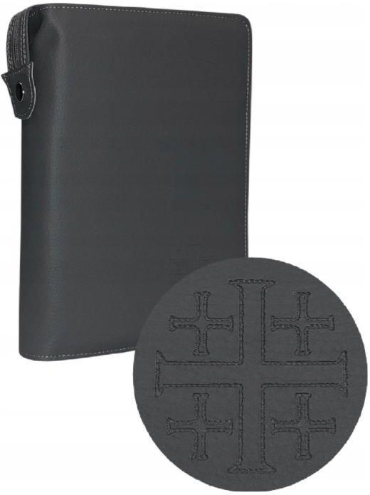 Stylowe etui na Biblię Jerozolimską – w kolorze szarym z tłoczonym zdobieniem Podaruj swojej Biblii Jerozolimskiej oprawę, która łączy w sobie elegancję, ochronę i duchową symbolikę. Etui w szarym kolorze to doskonały prezent na chrzciny, bierzmowanie, jubileusz czy każdą inną okazję. Jego elegancki, ale prosty design z pewnością przypadnie do gustu każdemu odbiorcy. Na froncie widnieje subtelny, tłoczony krzyż jerozolimski, który nadaje okładce wyjątkowy, a zarazem uniwersalny wygląd. Ochrona i funkcjonalność Trwałe materiały: Wysoka jakość wykonania zapewnia ochronę przed zabrudzeniami, uszkodzeniami i zużyciem podczas codziennego użytkowania. Idealne dopasowanie: Etui stworzone z myślą o małym formacie Biblii Jerozolimskiej (13,5 x 18,5 cm), co gwarantuje wygodne i bezpieczne przechowywanie. Zapięcie na suwak: Solidny suwak chroni zawartość i ułatwia dostęp do Biblii w każdej chwili.