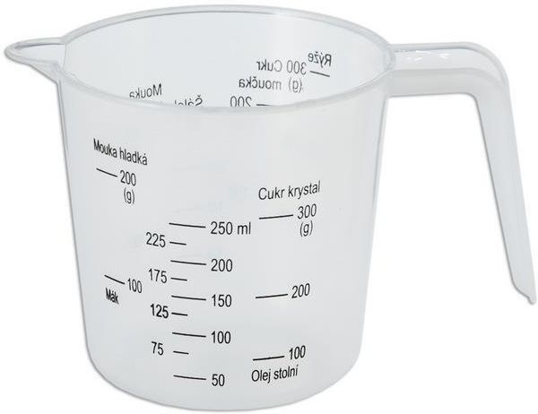 Jedna gwiazdka mniej bo korzystam tylko z jednej funkcji, objętości w mililitrach. Podziałka niedokładna, sprawdziłem wagą. U mnie im mniejsza objętość tym różnica większa, przy 75g wody pokazuje jakieś 62,5ml. Nie sprawdzałem skal pokazujących wagi ryżu mąki, cukru itd. Mogłoby zabrać kolejne gwiazdki. Jak zna się jej niedoskonałości to nawet napisy po czesku nie przeszkadzają.