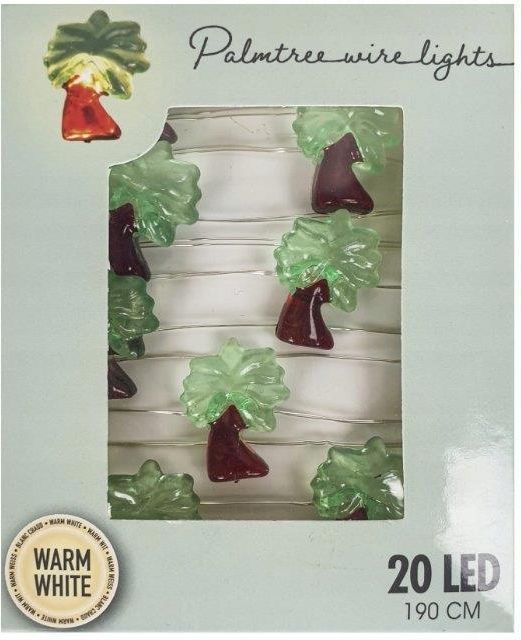 Łańcuch świetlny Lampki Led Palmy 20 Led 190 cm Lampki przypominające palmy, na baterie oświetlą pięknie Twoje pomieszczenie w domu lub taras czy parapet na balkonie! Zachwyć gości tym tropikalnym oświetleniem! Lampki LED są dodatkowo bezpiecznym i nastrojowym wariantem oświetlenia domu. Idealnie nadaje się do domów, w których mieszkają małe dzieci. Barwa światła: ciepły biały. Energooszczędna dioda LED zapewnia bardzo długi czas pracy. Przełącznik on/off. Opis: Lampki zasilane bateriami 2xAA Dane techniczne: Kolor światła: Ciepły biały Rodzaj źródła światła: Żarówka LED Kolor: zielony i brązowy Rodzaj zasilania: Baterie Ilość: 20 LED Długość: 190 cm