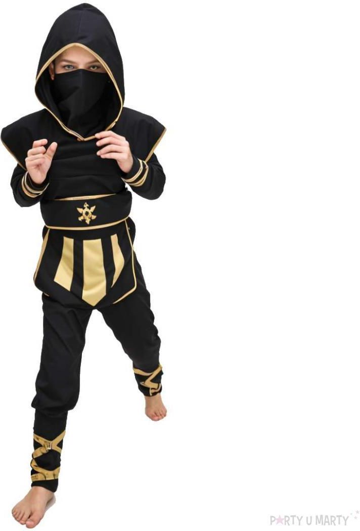 Strój Ninja czarny rozm. 96-116cm Partydeco ✅ ✔️ Strój Ninja, dziecięcy, rozmiar 96-116 cm (3-6 lat). Strój w kolorze czarnym ze złotymi, błyszczącymi wstawkami. Zestaw zawiera spodnie, koszulkę z długim rękawem, pasek, maskę na twarz oraz bezrękawnik z kapturem. Skład: 100% poliester. Wymiary …