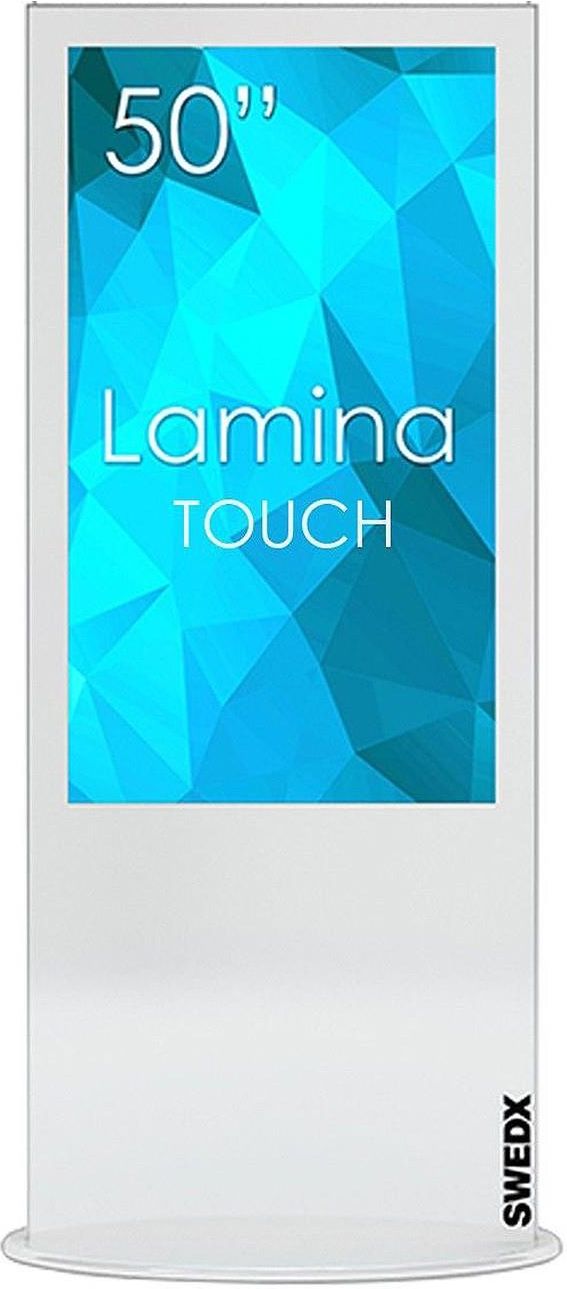 SWLT-50K8-A1 - SWEDX Touch Lamina 50 "- White / 4K in / 4K out SWEDX Lamina is the world's first freestanding 4K (UHD) display. Lamina is equipped with a 4K panel and a controller with 3x HDMI 2.0 inputs that support 60Hz 4K resolution/refresh rate. This enables reproduction of UltraHD media (images, video, and animations). UltraHD media is the latest and hottest resolution. Lamina is packed with thoughtful features/characteristics for maximum usage of digital signage, some of them are: Touch function (infrared - 10 points) Create playlists of pictures and videos automatic play TIMER for auto On / Off SMART HDMI! The display sleeps/wakes up based on the HDMI signal Wide range of Swedx digital signage players (Windows/Android) Wide range of accessories (shelves, mobile base, flightcase, etc.) Lockable rear door for protection of the equipment Space for installation of players in the backside Octanorm aluminum profile for mounting of accessories SWLT-50K8 Panel Aspect Ratio 9:16 Number of pixels 3840 x 2160 Features Refresh Frequency 120 Hz Contrast Ratio(type) 4000:1 Static. 100 000:1 Dynamic Brightness(cd m2) 350 Response time 9.5ms Viewing Angle 178/178 Audio Out 2 x 10W Power Power Supply 110-240 V Power Consumption 110 W Power Consumption Stand-by Lead presence Yes Mercury 0 mg Connections HDMI (2.0) (HDCP 2.2) Supported signals: 480P/480I/576P/576I//720P/1080I/1080P/2160P 3 USB Media Player 2 VGA 1 VGA Audio-in 1 Component (YPbPr) Supported signals: 480P/480I/576P/576I//720P/1080I/1080P 1 AV 1 Digital Audio (Coaxial) 1 Touch Connection USB 2.0 1 Supported OS WIN10 WIN8, WIN7, WIN2000 / XP / Vista, Linux, Mac OS, Android Touch Features Touch Technology Infrared Sensing Objects Finger, Pen Toucn Points 10 Resolution 4096x4096 Touch Glass Thickness 4 mm Surface Hardness 7 Mohs Touch Power Power source USB Power Consumption 1 W Dimension and Weight Outline Dimension (mm) 1820x810x450 Weight 51 Package Dimension (mm) 1950x900x160 Weight 64
