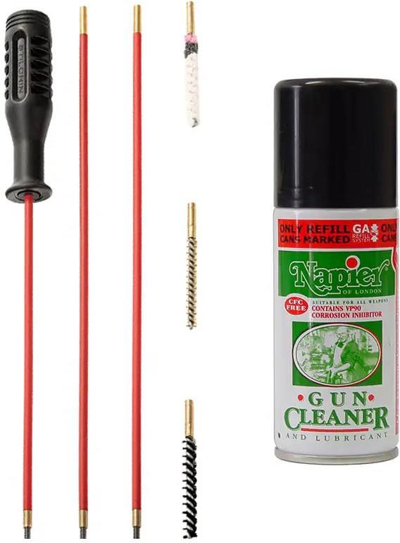 Zestaw do czyszczenia luf o kalibrze 4,5 mm składający się z trzyczęściowego pręta wykonanego ze stali powleczonej tworzywem, trzech końcówek oraz smaru do czyszczenia i konserwacji broni.