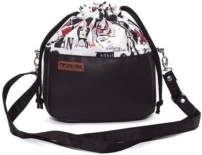 Czarna torebka sakiewka z motywem fashion – handmade Stylowa i nowoczesna torebka w kształcie sakiewki, uszyta z połączenia czarnej ekoskóry i tkaniny z nadrukiem inspirowanym światem mody. Na tkaninie widoczne są ilustracje kobiecych sylwetek i napisów w odcieniach czerni, bieli i czerwieni – to …