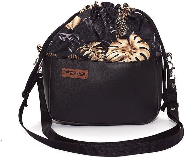 Czarna torebka sakiewka z motywem Złoty Monster – handmade Stylowa torebka w kształcie sakiewki, wykonana z połączenia czarnej ekoskóry i tkaniny z eleganckim motywem złotych liści monstera. To model, który łączy subtelną klasykę z odrobiną blasku, dodając każdej stylizacji wyjątkowego charakteru. Torebka ma jedną komorę główną zamykaną na sznurek troczek, co zapewnia szybki dostęp i wygodę użytkowania. Regulowany pasek (78–146 cm) pozwala dopasować długość do swoich potrzeb, a możliwość jego odpięcia ułatwia przechowywanie lub wymianę. Najważniejsze cechy produktu Wymiary: 27 cm (wys.) × 26 cm (szer.) × 7 cm (gł.) Długość paska: 78–146 cm, regulowany i odpinany Zapięcie: sznurek troczek Materiał: ekoskóra + poliester ze wzorem Kolor: czarny Kolor okuć: srebrny Wykonanie: handmade – uszyta w Polsce Dla kogo? Torebka Sakiewka Czarna z Motywem Złoty Monster to idealny wybór dla kobiet, które lubią eleganckie dodatki z nutą oryginalności. Sprawdzi się na co dzień, do pracy lub na wieczorne wyjście. Stylowa, praktyczna i jedyna w swoim rodzaju.