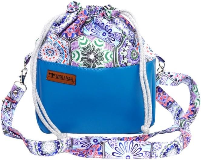Niebieska torebka sakiewka z geometrycznym wzorem – handmade Wyjątkowa mała torebka w kształcie sakiewki w intensywnym, niebieskim kolorze. Jej nowoczesny charakter podkreśla kolorowy, geometryczny wzór na tkaninie poliestrowej. Połączenie tych elementów tworzy ciekawy, lekko artystyczny design, idealny dla kobiet, które lubią oryginalne dodatki. Torebka posiada jedną komorę główną zamykaną na sznurek troczek – wygodne i lekkie rozwiązanie na co dzień. W środku znajduje się miejsce na najpotrzebniejsze drobiazgi. Regulowany pasek o długości 78–146 cm pozwala dopasować sposób noszenia do sylwetki i stylizacji. Pasek jest również odpinany, dzięki czemu można go łatwo wymienić. Najważniejsze cechy produktu Wymiary: 27 cm (wys.) × 26 cm (szer.) × 7 cm (gł.) Długość paska: 78–146 cm, regulowany i odpinany Zapięcie: sznurek troczek Materiał: ekoskóra + poliester ze wzorem Kolor: niebieski Kolor okuć: srebrny Wykonanie: handmade – uszyta w Polsce Dla kogo? Niebieska torebka sakiewka z geometrycznym wzorem to idealna propozycja dla kobiet, które cenią połączenie funkcjonalności i oryginalnego stylu. Lekka, poręczna i unikalna – doskonale sprawdzi się na spacerze, w pracy czy w podróży. Każdy egzemplarz szyty ręcznie, dlatego jest jedyny w swoim rodzaju.🌸