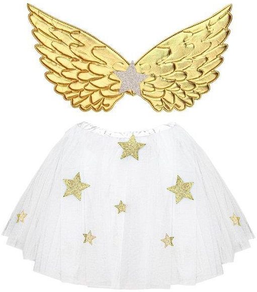 Strój dla dzieci aniołek to kompletny i efektowny zestaw, który pozwoli każdemu dziecku przemienić się w urokliwego aniołka. Złote skrzydła wykonane z błyszczącego tworzywa sztucznego zostały starannie wymodelowane tak, by przypominały delikatne pióra, co nadaje im realistyczny i elegancki wygląd. Do kompletu dołączona jest rozkloszowana spódniczka TuTu, ozdobiona subtelnym nadrukiem złotych gwiazdek, który dodaje całości magicznego, świątecznego charakteru. Spódniczka jest lekka i wygodna, a jej uniwersalny rozmiar sprawia, że łatwo dopasuje się do różnych sylwetek dziecięcych. Ten zestaw idealnie sprawdzi się podczas karnawałowych zabaw, szkolnych jasełek, przedstawień teatralnych czy innych uroczystości, w których dziecko chce poczuć się jak prawdziwy aniołek. To wyjątkowa propozycja dla małych aktorów i wszystkich, którzy kochają bajkowe przebrania pełne blasku i magii. EAN: 8003558103225