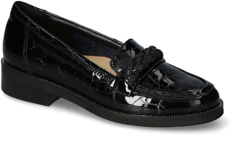 Modne mokasyny damskie Pulso: - cholewka wykonana została ze skóry naturalnej lakierowanej - wnętrze pokryte zostało skórą naturalną aby zapewnić komfort podczas użytkowania - wkładka wewnętrzna wykonana ze skóry naturalnej - obcas o wys. 3 cm zapewnia odpowiednią stabilizację - czarny kolor, piękny wzór i modny fason tworzą efekt, który zachwyci każdego!