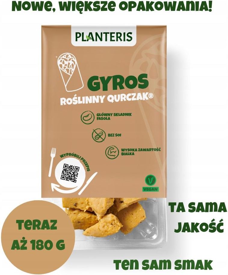 NA CIENKIM CZY NA GRUBYM?? A może w fit sałatce, na ulubionej zapiekance, lub z frytkami i ketchupem? Roślinnego Qurczak® Gyros nie lubi ograniczeń, więc się dobrze dogadacie! WARTOŚCI ODŻYWCZE Roślinnego Qurczaka® są bardzo zbliżone do piersi drobiowej. Dlatego śmiało używajcie go w swojej kuchni do przygotowania zbilansowanych dań, które będą nie tylko pożywne i proste w przygotowaniu, ale przede wszystkim PYSZNE. Wystarczy, że UPIECZECIE, USMAŻYCIE lub ZGRILLUJECIE i dodacie do reszty składników - zupełnie tak, jakbyście przyrządzali pierś drobiową (sorry za porównanie). Proste, a FENOMENALNE! Po otrzymaniu przesyłki, Roślinnego Qurczak® Gyros włóżcie do lodówki. W razie potrzeby możecie go przechowywać w zamrażarce poniżej -18°C do 3 miesięcy. Przed przygotowaniem, pamiętajcie, aby go rozmrozić. Data przydatności do spożycia Roślinnego Qurczaka®: min. 14 dni w dniu dostawy. Masa netto: 180 g Roślinny półprodukt garmażeryjny w marynacie na bazie oleju z przyprawami, chłodzony. Spożyj po obróbce termicznej. Pakowany w atmosferze ochronnej. Składniki: Roślinny Qurczak® 85,4 % (woda, fasola, białko pszenne, suszona cebula i czosnek, olej rzepakowy, ekstrakt drożdżowy, sól), marynata 14,6 % [olej rzepakowy 87,4 %, mieszanka przypraw 12,6 % (przyprawy (w tym gorczyca), sól, suszona cebula, zioła, suszony czosnek, cukier, ekstrakt drożdżowy, ekstrakty przypraw (zawierają seler))]. Informacje dla alergików: Produkt może zawierać soję oraz nasiona sezamu. Wartość odżywcza w 100 g Wartość energetyczna 1041 kJ/ 249 kcal Tłuszcz 13 g w tym kwasy tłuszczowe nasycone 1,1 g Węglowodany 5,1 g w tym cukry 5,0 g Błonnik 4,6 g Białko 26 g Sól 1,5 g Warunki przechowywania: Przechowuj w temperaturze od 0 °C do +6 °C. Po otwarciu opakowania przechowuj w lodówce i spożyj w ciągu 24 godzin. Sposób przygotowania Rozgrzej tłuszcz na patelni. Smaż Roślinnego Qurczaka na średnim ogniu przez co najmniej 4 minuty. Rozgrzej piekarnik do 180 °C. Piecz Roślinnego Qurczaka przez około 15 minut.