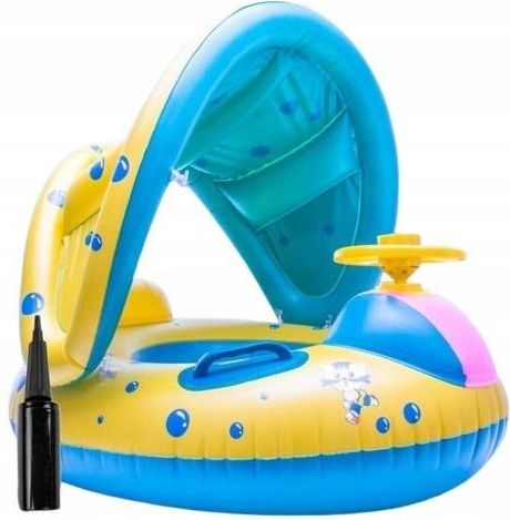 Koło do pływania Materac dmuchany Pontonik dla dzieci z daszkiem z kierownicą Pompka ręczna Sun Baby Cechy produktu materiał: wykonany z wysokiej jakości tworzywa PCV maksymalna waga dziecka: 11 kg dla dzieci, które potrafią samodzielnie siedzieć odpinany daszek, obracająca się kierownica, klakson wydający dźwięk oddzielne komory powietrzne dla zwiększenia bezpieczeństwa zewnętrzne uchwyty mogą być używane przez rodziców do kontroli nad maluchem Wysokiej jakości materiał PCV Trwały i bezpieczny, odporny na przetarcia i przebicia, idealny na intensywne użytkowanie przez dzieci Maksymalna waga dziecka: 11 kg Specjalnie zaprojektowany dla najmłodszych, którzy dopiero odkrywają uroki wodnych zabaw Dla dzieci, które potrafią samodzielnie siedzieć Umożliwia bezpieczną zabawę dla maluchów, które pewnie siedzą, dając im poczucie stabilności Odpinany daszek Chroni przed słońcem, zapewniając cień w najgorętsze dni, a jednocześnie można go łatwo zdjąć, gdy nie jest potrzebny Oddzielne komory powietrzne Zwiększają bezpieczeństwo, zapewniając stabilność i unoszenie się na wodzie, nawet w razie uszkodzenia jednej z komór Zewnętrzne uchwyty Mogą być używane przez rodziców do kontroli nad maluchem, zapewniając dodatkowe wsparcie i pewność podczas zabawy Obracająca się kierownica z klaksonem Dodatkowa atrakcja, która pozwala dziecku poczuć się jak mały kapitan Nasz pontonik to więcej niż zwykłe koło do pływania. To przemyślany projekt, który łączy funkcjonalność z zabawą. Twoje dziecko będzie mogło cieszyć się wodnymi przygodami, a Ty będziesz spokojny o jego bezpieczeństwo. Idealny na basen, jezioro czy morze – nasz produkt to must-have każdego letniego wypadu! Teraz do zestawu dołączono również ręczną pompkę tłokową, dzięki której napompowanie pontonika będzie szybkie i bezproblemowe. Ręczna pompka tłokowa to praktyczne narzędzie, które pozwala na łatwe i szybkie przygotowanie pontonika do zabawy. Dzięki solidnej konstrukcji i wydajnemu mechanizmowi tłokowemu, wystarczy kilka ruchów, aby napełnić powietrzem wszystkie komory. GALERIA ZDJĘĆ