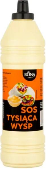 Sos Tysiąca Wysp 900g BONA Sos tysiąca wysp - kremowy sos o łagodnym smaku. Idealny sos do sałatek i kanapek, którego podstawowym składnikiem jest majonez. Składniki: woda, olej rzepakowy, cukier, skrobia modyfikowana, koncentrat pomidorowy, musztarda (ocet spirytusowy, woda, mączka z gorczycy, …