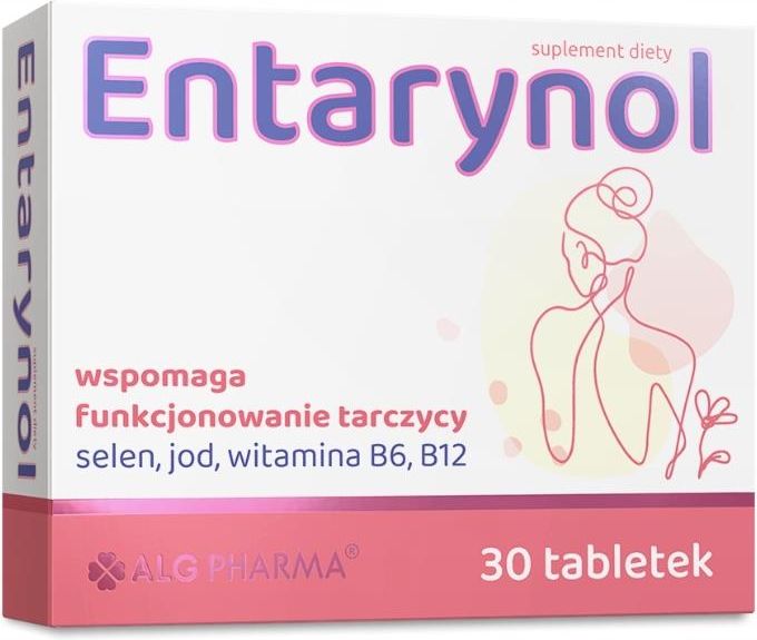 ALG PHARMA Entarynol 30 tabl Entarynol to innowacyjny suplement diety, który został zaprojektowany z myślą o wsparciu prawidłowego funkcjonowania tarczycy. Suplementacja minerałów i witamin jest szczególnie istotna w przypadku osób z ograniczoną dietą, co czyni ten produkt doskonałym wyborem dla każdego, kto pragnie zadbać o swoje zdrowie i samopoczucie. Dzięki starannie dobranym składnikom, Entarynol może przyczynić się do poprawy jakości życia. Skład i działanie Suplement diety w postaci tabletek zawiera 30 sztuk, co zapewnia miesięczną kurację. Tabletki są łatwe do przyjmowania – wystarczy popić je wodą. Ten suplement powinien być przechowywany w temperaturze od 15 do 25°C, w miejscu niedostępnym dla dzieci, aby zapewnić jego bezpieczeństwo. W składzie Entarynolu znajdują się kluczowe składniki aktywne, które przyczyniają się do jego skuteczności. Oto pełna lista składników oraz ich działanie: Jod (jodek potasu) – 150 µg (100% RWS) – niezbędny do produkcji hormonów tarczycy, co jest kluczowe dla metabolizmu, Selen (L-selenometionina) – 100 µg (182% RWS) – wspiera funkcje tarczycy i działa jako przeciwutleniacz, Tiamina (monoazotan tiaminy) – 2 mg (182% RWS) – przyczynia się do prawidłowego funkcjonowania układu nerwowego, Ryboflawina – 2,1 mg (150% RWS) – wspomaga zdrową skórę oraz metabolizm energetyczny, Witamina B6 (chlorowodorek pirydoksyny) – 3 mg (214% RWS) – ma istotne znaczenie dla regulacji aktywności hormonalnej, Witamina B12 (cyjanokobalamina) – 3 µg (120% RWS) – wspiera układ odpornościowy oraz metabolizm homocysteiny, Kwas foliowy (kwas pteroilomonoglutaminowy) – 400 µg (200% RWS) – uczestniczy w podziałach komórkowych i produkcji krwi. Dzięki tym składnikom, ten suplement wspiera prawidłowe funkcjonowanie tarczycy oraz produkcję hormonów. Jod i selen są kluczowe dla utrzymania równowagi metabolicznej, a witaminy B6 i B12 przyczyniają się do ogólnego zdrowia organizmu. Zalety Ten produkt oferuje wiele korzyści zdrowotnych i może być stosowany przez osoby, które pragną wzmocnić swoje zdrowie. Oto kluczowe zalety Entarynolu: wspomaga prawidłowe funkcjonowanie tarczycy, ułatwia regulację produkcji hormonów, wzmacnia układ odpornościowy, przyczynia się do zdrowia skóry. Suplementacja tym produktem jest idealnym rozwiązaniem dla osób, które chcą uzupełnić swoją dietę w cenne składniki odżywcze. Dawkowanie i przeciwwskazania Zalecane dawkowanie to jedna tabletka dziennie, przyjmowana z wodą. Ważne jest, aby nie przekraczać zalecanej porcji produktu, aby uniknąć potencjalnych skutków ubocznych. Przed rozpoczęciem suplementacji zawsze zaleca się konsultację z lekarzem, zwłaszcza jeśli masz jakiekolwiek wątpliwości. Przeciwwskazania do stosowania obejmują uczulenie na którykolwiek ze składników zawartych w produkcie. Osoby w ciąży lub karmiące piersią powinny również skonsultować się z lekarzem przed rozpoczęciem suplementacji. Ponadto, suplementacja powinna być traktowana jako uzupełnienie diety, a nie jako substytut zdrowego odżywiania. Dodatkowe cechy Entarynol wyróżnia się dodatkowymi cechami, które mogą być istotne dla osób poszukujących bezpiecznych i zdrowych suplementów. Produkt jest wolny od parabenów, sulfatów i ftalanów, co czyni go odpowiednim wyborem dla osób z wrażliwą skórą. Oto dodatkowe cechy, które warto znać: produkt jest dostępny w wygodnej formie tabletek, nie zawiera sztucznych barwników ani konserwantów, odpowiedni dla wegetarian, łatwy w przechowywaniu i użytkowaniu, spełnia normy jakościowe obowiązujące w Polsce. Ponadto, należy pamiętać, że produkt powinien być przechowywany w miejscu niedostępnym dla dzieci, co jest kluczowe dla bezpieczeństwa. Entarynol to doskonały wybór dla każdego, kto pragnie wspomóc swoje zdrowie poprzez odpowiednią suplementację. Dzięki starannie dobranym składnikom, ten suplement stanowi wartościowe wsparcie dla organizmu, przyczyniając się do ogólnego dobrego samopoczucia i zdrowia.