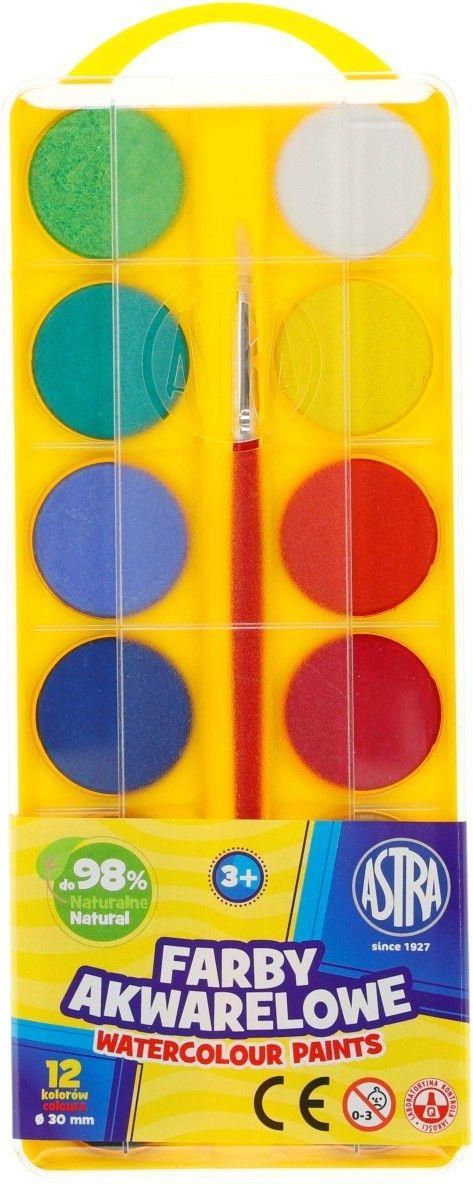 Akwarelowe farby wodne do malowania na papierze - okrągłe suche guziczki farby umieszczone są w plastikowej kasetce. Farba po zwilżeniu wodą jest gotowa do użycia.