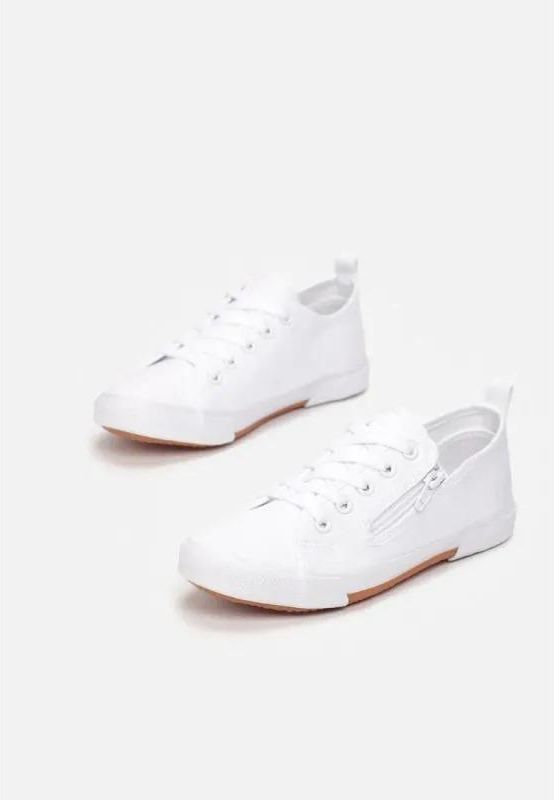 Trampki Shiverrie na płaskiej, kauczukowej podeszwie z delikatnymi żłobieniami. Z cholewką przed kostkę wiązanym na płaskie sznurowadła. Po boku dodatkowy zamek błyskawiczny. Wykonane z materiału tekstylnego. Świetnie sprawdzą się jako buty do noszenia po szkole! Kolor: Biały Rozmiarówka: Typowa …