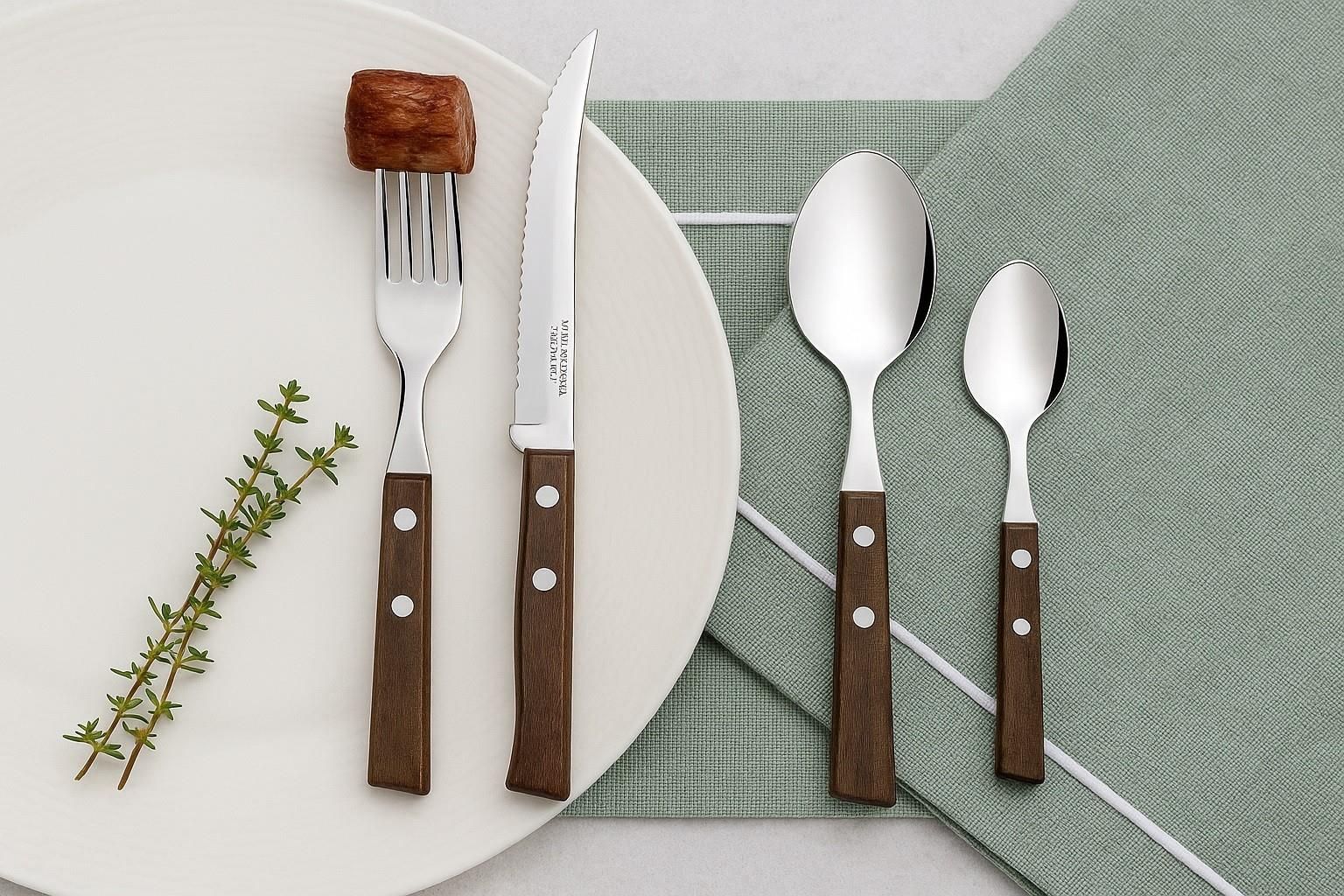 Wprowadź rustykalny urok do każdego posiłku, sięgnij po niezwykły 24-elementowy zestaw sztućców Tramontina Tradicional. Ten starannie zaprojektowany komplet łączy funkcjonalność z naturalnym pięknem, tworząc harmonijną całość, która zachwyci każdego miłośnika tradycyjnego stylu. Ostrza ze stali nierdzewnej gwarantują niezawodną siłę krojenia, umożliwiając precyzyjne i komfortowe przygotowywanie potraw, podczas gdy widelce i łyżki, z ich specjalną grubością i starannym tłoczeniem, wyróżniają się wyjątkową trwałością i wytrzymałością. Rękojeści z naturalnego drewna dodają całości ciepła i autentycznego charakteru, przywołując na myśl dawne, przytulne domy i tradycyjne stoły. Ten zestaw nie tylko ułatwi codzienne posiłki, ale także stanie się pięknym elementem dekoracyjnym, podkreślając rustykalny urok Twojego domu i tworząc niezapomnianą atmosferę podczas każdego wspólnego posiłku. Ostrza ze stali nierdzewnej – to mistrzowska harmonia precyzji i trwałości. Ich powierzchnia, poddana starannej obróbce cieplnej, zyskuje nie tylko wyjątkową ostrość, ale także dłuższą żywotność, czyniąc każde cięcie nie tylko możliwym, ale i niezwykle komfortowym. Dzięki temu, narzędzia te zachowują swoją skuteczność przez długi czas, niezależnie od intensywności użytkowania. Widelec i łyżka, wykonane metodą tłoczenia stali, są grubsze i solidniejsze, co przekłada się na ich większą wytrzymałość i odporność na odkształcenia. Taka technika produkcji gwarantuje, że kształt elementów nie ulegnie zmianie nawet przy codziennym, intensywnym użytkowaniu, zapewniając stabilność i pewność w każdej sytuacji. Rękojeści wykonane z naturalnego drewna dodają całości elegancji i ciepła, a jednocześnie są komfortowe w trzymaniu. Aluminiowe nity, mocno i pewnie łączące drewno z stalą, podkreślają wysoką jakość wykonania oraz dbałość o detale, zapewniając trwałe i estetyczne połączenie elementów. To połączenie natury i nowoczesności sprawia, że narzędzia te nie tylko funkcjonują perfekcyjnie, ale także zachwycają swoim wyglądem. Skład zestawu: 6 x nóż stołowy 19,4 cm 6 x widelec stołowy 19,3 cm 6 x łyżka stołowa 19,1 cm 6 x łyżeczka 15,2 cm Wykonanie: Ostrze wykonane jest ze stali nierdzewnej AISI 420, która odpowiada stali DIN 1.4028. Uchwyt Polywood wykonany z impregnowanego drewna połączony aluminiowymi nitami. Produkt posiada 5 lat gwarancji producenta. Całość zapakowana jest w pudełko. Stanowi doskonały pomysł na prezent. Zdjęcie tytułowe ma charakter poglądowy. Prezentowana aranżacja może zawierać elementy dekoracyjne niewchodzące w skład zestawu. Szczegóły dotyczące zawartości znajdują się w opisie produktu.