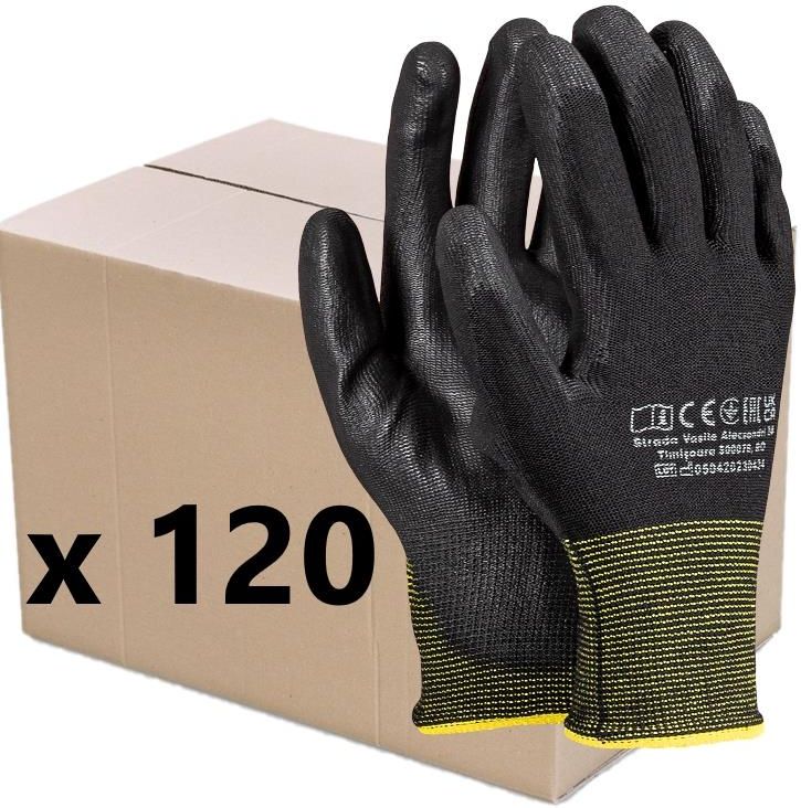 Rękawice Robocze powlekane Poliuretanem - Precyzyjne Czarne rozmiar 10 / XL ZESTAW 120 PAR ! Na pozostałych aukcjach są komplety po 6, 10, 12, 120 i 240 par Rękawice ochronne wykonane z poliestru, powlekane poliuretanem. zakończone ściągaczem zapewniają manualność oraz doskonałe czucie trzymanego przedmiotu wykazują bardzo dużą elastyczność oraz świetnie dopasowują się do dłoni idealne do prac, gdzie wymagana jest precyzja Zbiorczo pakowane po 12 par w worek foliowy i 240 par w kartonie. Zapraszamy na pozostałe aukcje!