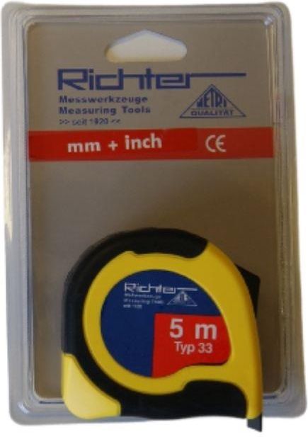 Poręczna dwustronna miarka zwijana 33/5 m+z, Richter Taśma okryta powłoką antypoślizgową dla pewniejszego chwytu. Przycisk blokady w obudowie, automatyczne zwijanie, metalowy zaczep do pasa. Stal pokryta powłoką lakieru w celu ochrony przed korozją. Parametry: Skala: centymetrowa + cale Długość: 5 …