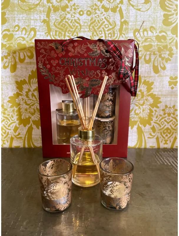 Wspaniały zestaw upominkowy składający się z 2 szklanych podgrzewaczy i dyfuzora o uroczym, świątecznym zapachu goździków i imbiru