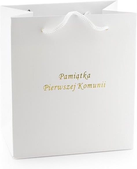 Torebka prezentowa - Pamiątka Pierwszej Komunii WYMIARY szerokość: 100mm długość: 160mm wysokość: 180mm OPIS: Torebka prezentowa w kolorze białym ze złotym napisem "Pamiątka Pierwszej Komunii" Dobrze komponuje się z zegarkami z kolekcji komunijnej.