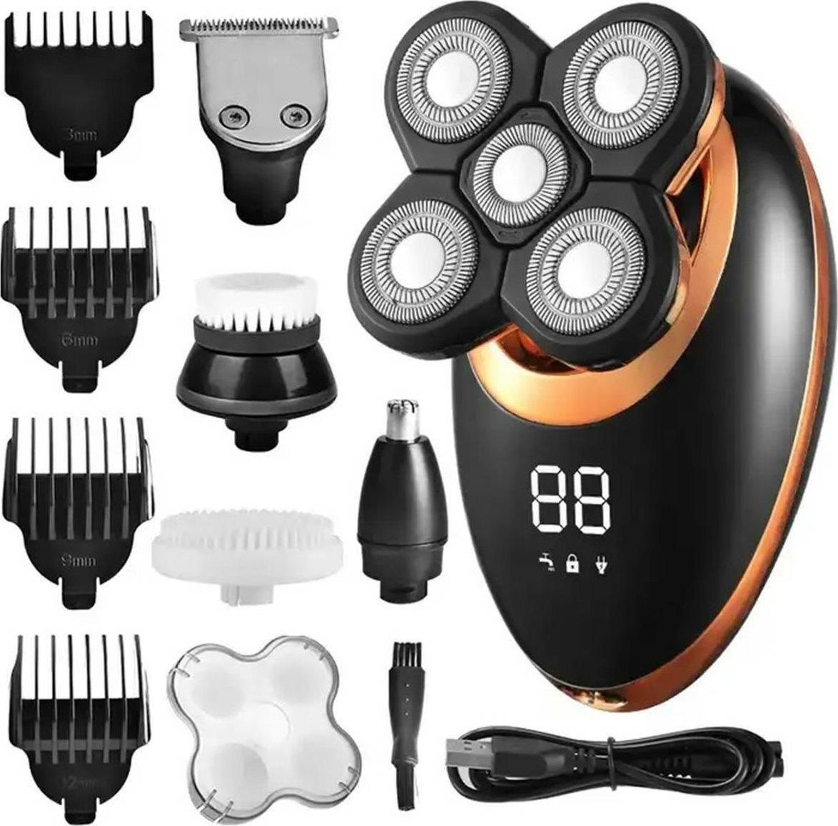 MĘSKA GOLARKA 5W1 – MASZYNKA DO GOLENIA BRODY, WŁOSÓW I GŁOWY Z FUNKCJĄ TRYMERA WIELOFUNKCYJNA ELEKTRYCZNA GOLARKA MĘSKA 5W1 – PIELĘGNACJA TWARZY, GŁOWY I CIAŁA W JEDNYM URZĄDZENIU Golarka RQ 6900 5w1 to idealne rozwiązanie dla mężczyzn, którzy oczekują kompleksowej pielęgnacji twarzy, głowy i ciała w jednym, wygodnym zestawie. Dzięki niej codzienne zabiegi pielęgnacyjne stają się szybkie, proste i niezwykle efektywne. Urządzenie pozwala zadbać o profesjonalny wygląd bez konieczności wizyt u fryzjera czy kosmetyczki, zapewniając pełną kontrolę nad stylem i komfort w domowych warunkach. Ergonomiczny kształt, cyfrowy wyświetlacz oraz wydajna bateria zapewniają wygodę użytkowania, a wodoodporność umożliwia korzystanie z urządzenia na mokro i na sucho. Głowice w zestawie 1 - Szczoteczka oczyszczająca do twarzy 2 - Głowica masująca do twarzy 3 - Golarka rotacyjna 4 - Trymer do nosa i uszu 5 - Precyzyjny trymer do brody ZESTAW DO GOLENIA Z NASADKAMI, TRYMEREM DO NOSA I SZCZOTECZKĄ DO TWARZY W skład zestawu wchodzą cztery nasadki do głowicy z trymerem o długościach 3 mm, 6 mm, 9 mm i 12 mm, które umożliwiają precyzyjne dopasowanie długości cięcia do indywidualnych potrzeb. Dzięki nim można łatwo i dokładnie przyciąć brodę, wąsy lub włosy na preferowaną długość, uzyskując idealny efekt stylizacji. Trymer do nosa i uszu, pozwala na bezpieczne usunięcie niechcianych włosków z trudno dostępnych miejsc, zapewniając schludny i zadbany wygląd. Szczoteczka do twarzy jest doskonałym dodatkiem do codziennej pielęgnacji. Zaprojektowana tak, aby delikatnie oczyszczać skórę, skutecznie usuwa zanieczyszczenia, martwe komórki naskórka i nadmiar sebum. Regularne stosowanie szczoteczki pomaga w uzyskaniu świeżej i zdrowo wyglądającej skóry, a także poprawia wchłanianie kosmetyków pielęgnacyjnych. Szczoteczka do masażu to element, który uzupełnia pielęgnację i relaksuje skórę. Masaż twarzy przy pomocy szczoteczki pobudza krążenie krwi, co wpływa na poprawę elastyczności skóry i jej zdrowy wygląd. Dodatkowo masaż relaksuje mięśnie twarzy, przynosząc odprężenie i dając uczucie świeżośc ZALETY GOLARKI ROTACYJNEJ RQ 6900 – IDEALNY WYBÓR DLA WYMAGAJĄCYCH UŻYTKOWNIKÓW Lepsze dopasowanie do kształtu twarzy - Golarka rotacyjna RQ 6900 z ruchomymi głowicami precyzyjnie dopasowuje się do konturów twarzy, ułatwiając golenie trudno dostępnych miejsc, takich jak linia żuchwy i podbródek, dla idealnie gładkiej skóry. Szybsze golenie dużych powierzchni - Szeroka głowica golarki RQ 6900 doskonale sprawdza się zarówno do golenia twarzy, jak i większych powierzchni, takich jak głowa. Dzięki temu można ogolić duże partie skóry w zaledwie 2 minuty, co zapewnia szybkie i równomierne golenie przy minimalnym wysiłku. Mniejsze ryzyko podrażnień - Okrężny ruch głowic minimalizuje ryzyko podrażnień, co sprawia, że golarka RQ 6900 jest idealna dla osób o wrażliwej skórze, zapewniając komfort i bezpieczeństwo podczas golenia. Możliwość użycia na mokro i sucho - Golarka RQ 6900 5w1 jest w pełni wodoodporna, co pozwala na golenie na sucho oraz na mokro, z możliwością stosowania pianki lub żelu, co zwiększa komfort i zmniejsza ryzyko podrażnień. Łatwa konserwacja i czyszczenie - Wodoodporna konstrukcja umożliwia szybkie czyszczenie golarki pod bieżącą wodą, co zapewnia higienę i dłuższą żywotność urządzenia. Golarka RQ 6900 została wyposażona w wydajny i energooszczędny silnik, który zapewnia stabilną moc. Dzięki temu urządzenie działa płynnie i bez wysiłku, gwarantując idealne efekty golenia za każdym razem. Lekka konstrukcja o wadze zapewnia wygodne użytkowanie i minimalne obciążenie dłoni, nawet przy dłuższym goleniu. Golarka RQ 6900 to idealne połączenie mocy, mobilności i komfortu, które sprawdzi się w każdej sytuacji – w domu, podróży czy pod prysznicem. W zestawie Wielofunkcyjna maszynka / golarka męska Nasadka do strzyżenia 4 nakładki dystansujące do strzyżenia Nasadka typu trymer (do uszu i nosa) Szczotka do czyszczenia twarzy Gąbka do masażu twarzy Kabel zasilający (do ładowania) Szczoteczka do czyszczenia zestawu Osłona zabezpieczająca ostrza (głowicę), Specyfikacja Materiał: stal nierdzewna + plastik PP + plastik ABS Moc: 8W Zasilanie: wbudowany akumulator + kabel USB do ładowania Czas pracy: do 90 minut Kabel USB do ładowania urządzenia 4 nakładki nasadki dystansujące (3 / 6 / 9 / 12 mm) Nakładka do strzyżenia włosów Nakładka - trymer do nosa i uszu Gąbka do masażu twarzy Szczotka do czyszczenia twarzy Możliwość regulacji długości strzyżenia (3 / 6 / 9 / 12 mm) Ostrza o wysokiej wytrzymałości Czytelny wyświetlacz LCD Wymiary maszynki: 11 cm x 7,7 cm x 5,5 cm Kolor: czarno-złoty