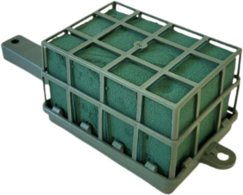 Gąbka florystyczna w plastikowej klatce z otworami do mocowania i uchwytem Wymiary klatki: Długość: 16 cm Szerokość: 12 cm Wysokość: 8 cm Wymiary z rączką: Długość 31 cm Szerokość 12 cm Wysokość: 8 cm Kod producenta: 2112