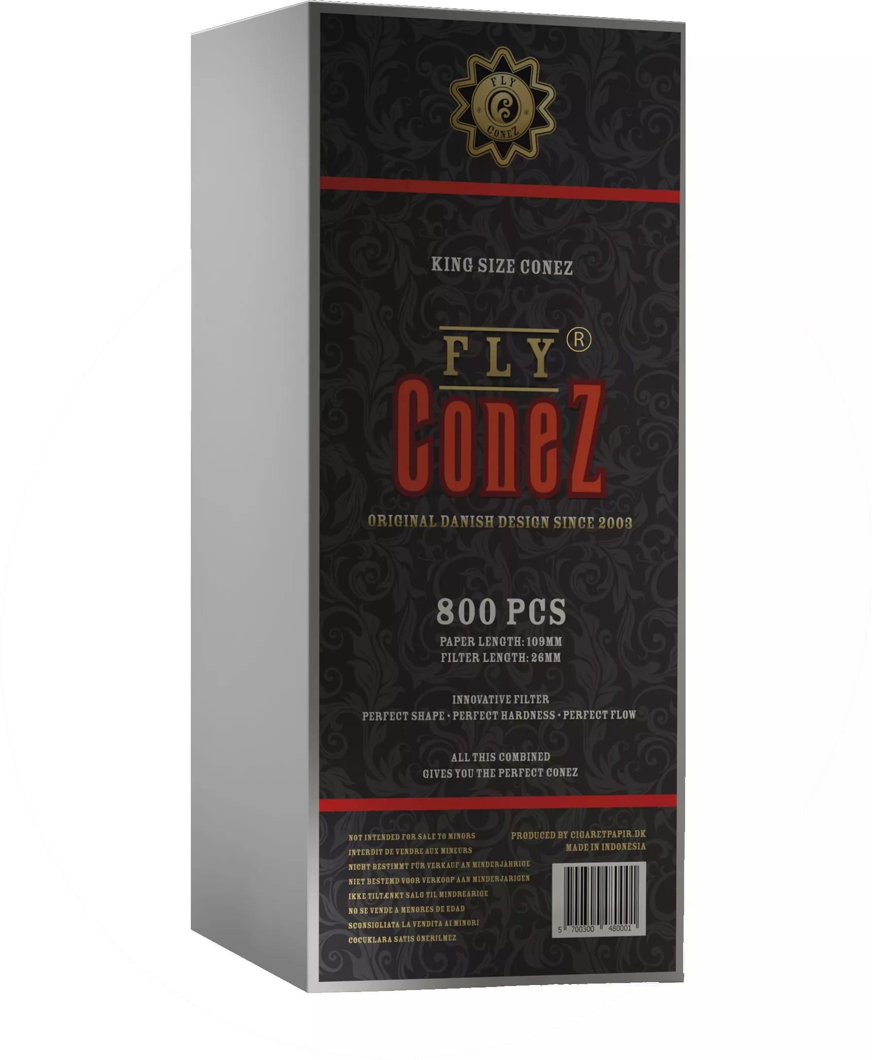 FLY Conez King Size 800 Classic gotowe skręcone bibułki Opakowanie 800 szt. gotowych do nabicia stożków FLY Conez. Bibułki z filtrami. Rozmiar King Size. Długość: 109 mm Filtr: 24 mm