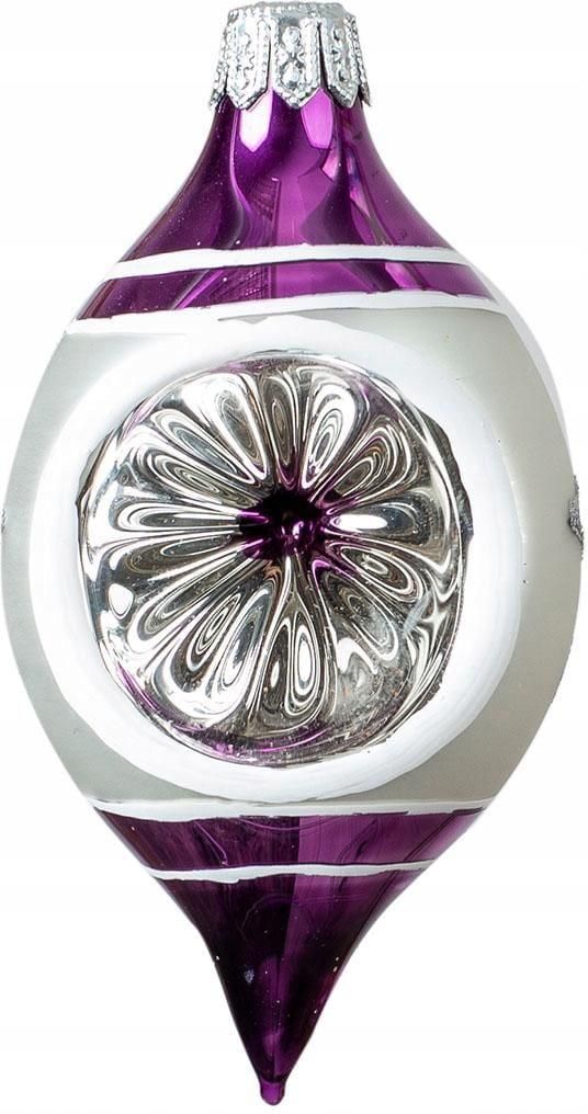 Bombka reflektor - fioletowa Bombka reflektor to sposób na ozdobienie choinki w stylu retro. Design ten pochodzi z przełomu lat 60 i 70 XX wieku i wyróżnia się dbałością o szczegóły i ponadczasowością. Szklana bombka retro reflektor wykonana została przez polskich rzemieślników techniką wydmuchiwania. Bombka posiada metalowy zaczep. Zdobiona ręcznie. Ze względu na ręczne wykonanie bombki mogą się nieznacznie różnić. Wymiary: wysokość: ok. 10 cm Folkstar