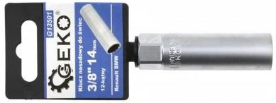 Klucz nasadowy do świec 3/8" 14mm 12-kąt GekoKlucz nasadowy 3/8 12-kątny do świec 14mm. Wykonany ze stali narzędziowej CRV. Nasadka specjalnie przystosowana do montażu / demontażu świec samochodowych z zapłonem iskrowym.