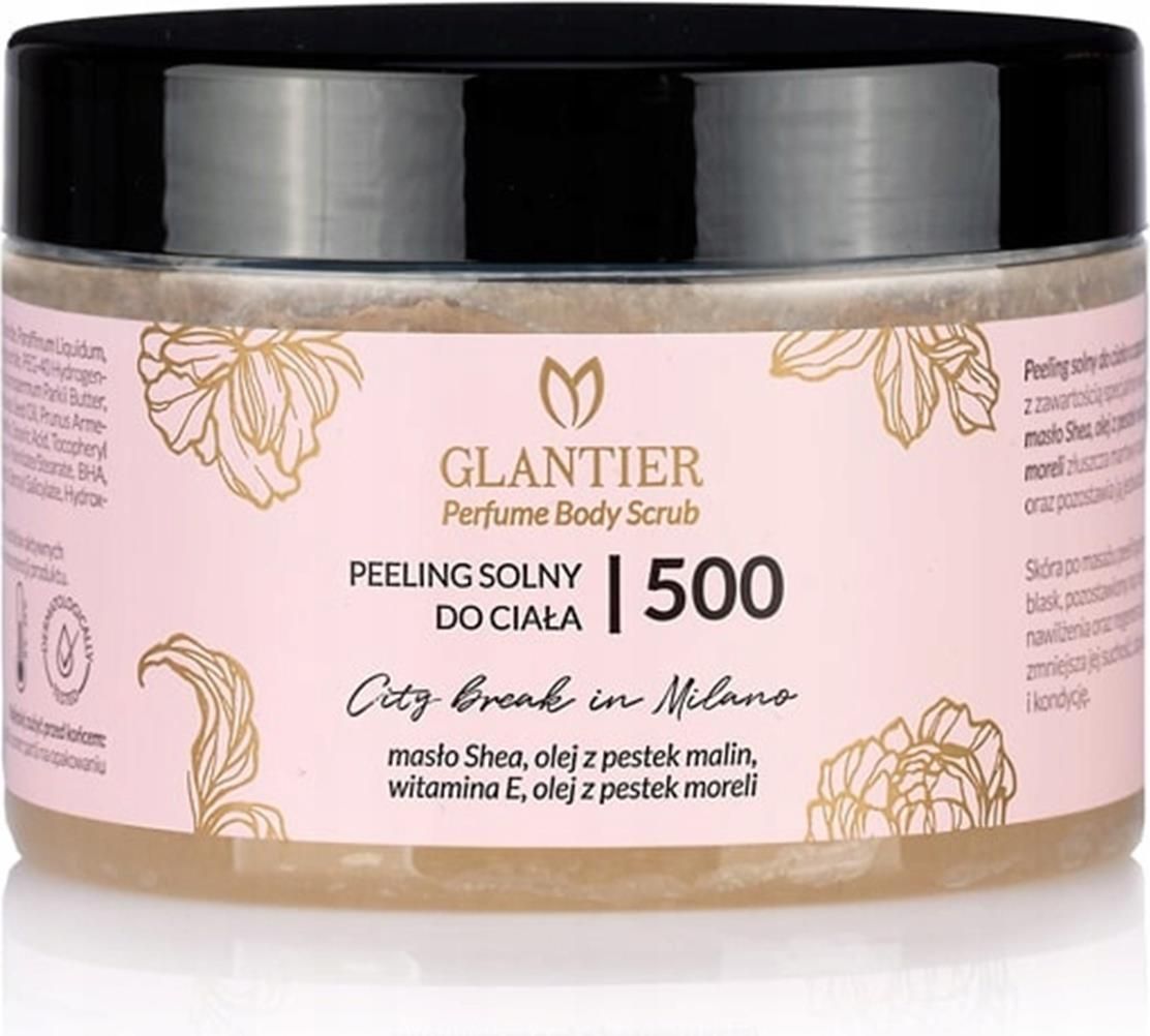 Glantier Peeling 300g 500 Peeling solny do ciała 500 o zapachu Szyprowo-Owocowych Perfum Glantier 500 to połączenie Twojego ulubionego zapachu z wyjątkową złuszczającą formułą. Najlepszy sposób na wygładzenie skóry i zapewnienie swoim zmysłom prawdziwej aromatycznej uczty. Peeling Glantier to nie tylko doskonałe złuszczanie, ale również nawilżanie i ochrona. Nasz produkt polecany jest do pielęgnacji każdego rodzaju skóry, w szczególności suchej i skłonnej do rogowacenia. Poprawia jej wygląd oraz kondycję, a przy tym raz na zawsze pozbawia Cię uczucia suchości i ściągnięcia. Oparty na bazie naturalnej polskiej soli kamiennej z Kopalni „Kłodawa” pielęgnuje i wzbogaca rytuał domowego SPA. Poczuj odprężenie, jak podczas wyczekiwanego weekendu w tętniącym życiem Mediolanie! Zapach: 500 Pojemność: 300 g Peeling solny do ciała 500- 300 gOdkryj peeling do ciała, który połączy Twoją pielęgnację z ulubionym zapachem Perfum Glantier 500. Nasz produkt to nie tylko sposób na wygładzenie skóry, ale również prawdziwa uczta dla zmysłów. Każde opakowanie peelingu Glantier to harmonijne połączenie luksusu i pielęgnacji. Nasza unikalna formuła zawiera delikatne drobinki złuszczające, które skutecznie usuwają martwy naskórek, jednocześnie nadając skórze gładkość i miękkość. Twoja skóra będzie wyraźnie odświeżona, odżywiona i aksamitna w dotyku. Już podczas pierwszego użycia poczujesz, jak zanurzasz się w niepowtarzalnym świecie zapachów, który jest znakiem rozpoznawczym naszej linii kosmetyków. Peeling Glantier to produkt typu "body scrub" otrzymany dzięki zastosowaniu naszej rodzimej soli kamiennej wydobytej w Kopalni Soli "Kłodawa". Te ścierające drobinki o różnorodnej wielkości mają właściwości delikatnie złuszczające martwy naskórek, co gwarantuje poprawę wyglądu i kondycji skóry. Kryształowa sól to cenny minerał, który widocznie redukuje uczucie szorstkości i suchości, przez co doskonale oczyszcza i odświeża ciało. Najlepsze efekty otrzymasz przy regularnym stosowaniu Peelingu solnego do ciała 1-2 razy w tygodniu. Taka częstotliwość masażu kosmetykiem pozwala na regenerację naskórka, a jednocześnie zapobiega jego rogowaceniu. Pozostawiona na niej warstwa ochronna zapewnia odpowiednie natłuszczenie, bez klejącego filmu. Produkt polecany również do pielęgnacji skóry bardzo suchej, po zastosowaniu poprawia jej wygląd i kondycję, przywracając blask i zdrowy koloryt. Porcja dobroczynnych dla ciała i zmysłów właściwości perfumowanego peelingu do ciała Glantier 500 została zamknięta w praktycznym odkręcanym opakowaniu o pojemności 300 g. Bogactwo składników aktywnychPeeling solny do ciała Glantier obfituje w specjalnie wyselekcjonowane składniki aktywne, takie jak: - masło Shea -olej z pestek winogron -olej z pestek malin -olej z pestek moreli -witaminę E Pielęgnuje skórę, pobudza zmysłyOprócz bogactwa składników aktywnych każda porcja naszego peelingu do ciała emanuje uwodzicielskim zapachem Perfum Glantier 500. Nuty czarnej porzeczki, zmysłowej frezji i aromatycznej majowej róży otulą Cię swoją elegancją i intensywnością. Poczuj, jak Twoja skóra wchłania nie tylko dobroczynne składniki, ale także każdą kroplę cudownego zapachu, tworząc subtelny i długotrwały aromat, który będzie towarzyszyć Ci przez cały dzień. Nasz peeling do ciała 500 to niezastąpiony produkt dla miłośniczek piękna, które pragną połączyć codzienną pielęgnację z wyjątkowym zapachem swoich ulubionych perfum. Twórz dla siebie bezcenne chwile luksusu, pozostawiając skórę jedwabiście gładką i pachnącą. Sposób użyciaNiewielką ilość produktu nanieś na wilgotną skórę i delikatnie masuj ciało. Następnie spłucz ciepłą wodą. Stosuj 1-2 raz w tygodniu. SOLNE PEELINGI DO CIAŁAGładka skóra to marzenie każdej kobiety. Nawilżone i zadbane ciało korzystniej przyjmuje składniki odżywcze zawarte w kosmetykach i na dłużej utrzymuje zapach perfum, ale przede wszystkim sprawia, że lepiej się czujemy. Nasze peelingi do ciała są tworzone na bazie polskiej kłodawskiej soli i regularnie pielęgnują Twoją skórę, by była ujędrniona i elastyczna każdego dnia. Wybierz jeden ze zmysłowych zapachów inspirowanych najlepszymi perfumami Glantier i daj się ponieść odprężającym chwilom podczas domowego SPA. Składniki/Ingredients:Sodium Chloride, Paraffinum Liquidum, Petrolatum, Caprylic/Capric Triglyceride, PEG-40 Hydrogenated Castor Oil, Silica, Parfum, Butyrospermum Parkii Butter, Vitis Vinifera Seed Oil, Rubus Idaeus Seed Oil, Prunus Armeniaca Kernel Oil, Cera Alba, Paraffin, Stearic Acid, Tocopheryl Acetate, Phenoxyethanol, Glyceryl Palmitate/Stearate, BHA, Ethylhexylglycerin, Benzyl Alcohol, Benzyl Salicylate, Hydroxycitronellal, Limonene, Linalool. Chcielibyśmy poinformować, że perfumy marki Glantier z numerkami zaczynającymi się na 4,5 lub 6 to zapachy damskie, natomiast te z numerami zaczynającymi się na 7 lub 8 to zapachy męskie.
