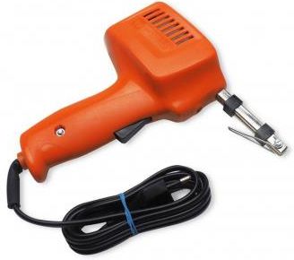 Lutownica transformatorowa ETP 4 moc 75W produkcji czeskiej firmy NUBA Lutownica transformatorowa ETP służy do lutowania miękkiego za pomocą spoiwa cynowo-ołowiowego Sn60Pb40. Wciśnięcie włącznika lutownicy powoduje rozgrzanie się grota, zwolnienie przycisku powoduje wyłączenie lutownicy. Po wyłączeniu lutownicy niektóre elementy mogą być jeszcze gorące, zalecamy więc zachowanie ostrożności. W celu poprawy jakości wykonywanych lutów zaleca się stosowanie np. kalafonii, topników. Miedziany grot jest częścią eksploatacyjną lutownicy. Żywotność grotu zależy od sposobu eksploatacji i wielkości lutowanych elementów. Wyeksploatowany grot znaczne pogorszenie procesu lutowania. Lutownica transformatorowa nie jest przeznaczona do pracy ciągłej, konieczne jest stosowanie przerw w pracy (najlepiej 10 sekund pracy, 30 sekund przerwy). Praca ze zniszczonym grotem może spowodować pryśnięcie spoiwa. Cechy moc: 75 W temperatura grota ok. 400°C zasilanie 230 V włącznik pistoletowy łatwa wymiana grota mocowanie grota na śruby wbudowana lampka podświetlająca miejsce lutowania bardzo szybkie nagrzewanie się grota Zestaw zawiera lutownica ETP4 75W -1szt. zestaw 6 grotów (5 zapasowych + 1 zamontowany w lutownicy) zapakowana w opakowanie typu blister