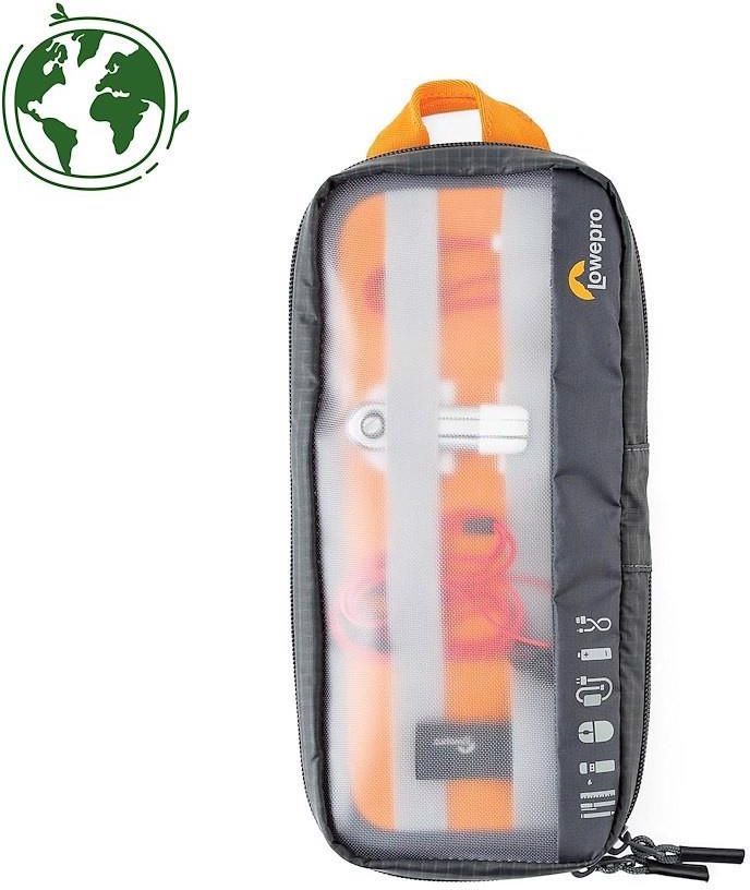Organizer Lowepro GearUp Pouch Medium - Green Line GearUp to modułowy system idealny do przechowywania i ochrony sprzętu oraz wielu akcesoriów znajdujących się w posiadaniu każdego podróżnika. Pouch Medium to średnich rozmiarów organizer, w którym znajdzie się miejsce na zasilacz i myszkę do laptopa, słuchawki czy przenośny dysk twardy. Gumowe paski w środku ułatwiają organizację sprzętu i zabezpieczają go przed przemieszczaniem się. Torba bez problemu zmieści się w walizce czy bagażu podręcznym. Główne cechy Idealny na średniej wielkości akcesoria takie jak zasilacz i myszkę do laptopa, słuchawki czy przenośny dysk twardy Wyciągany panel z gumowymi paskami do organizacji zawartości Dwustronny zamek ułatwiający dostęp do sprzętu Przeźroczysta szybka odporna na zarysowania Wymiary zewnętrzne: 28 x 4.5 x 14 cm Wymiary wewnętrzne: 26 x 4 x 11.5 cm Waga: 112 g Akcesoria Lowepro z serii „Green Line” wyprodukowano z materiałów pochodzących z recyklingu, a barwienie przeprowadzono nową, przyjazną dla środowiska metodą. Jest to nasz znak pokazujący jak daleko zaszliśmy w kierunku stworzenia całkowicie zrównoważonego ekologicznie produktu. Chcemy podzielić się z Wami tą drogą - jeszcze nie osiągnęliśmy 100%, ale jesteśmy coraz bliżej!