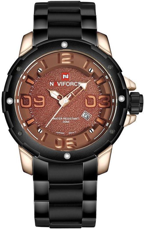 Zegarek męski NAVIFORCE MAXIR 9078-2A Już dziś wybierz swój nowy, elegancki, funkcjonalny, a co najważniejsze klasyczny zegarek, który sprawdzi się bez względu na okazję. Zegarek Maxir wyposażony został w niezawodny mechanizm kwarcowy, zapewniający wieloletnią żywotność oraz precyzyjne odmierzanie czasu. Nowoczesna tarcza zapewnia przejrzysty i czytelny wygląd. Koperta zegarka połączona została z metalową bransoletą. Wodoszczelność 30M oznacza że, zegarek jest odporny na zachlapania. Czasomierze te wyprodukowane są z bezpiecznych materiałów, które nie tylko nadają się dla osób z wrażliwą skórą, ale i również dla alergików. Zegarek sprawdzi się jako prezent, który zachwyci swoim wyglądem, funkcjonalnością oraz będzie stanowił wartościową pamiątkę. Nasza firma oferuje również dodatkowo płatną usługę grawerowania, dzięki której możemy podarować bliskiej nam osobie pamiątkę w formie dedykacji na zegarku, co stanowi niepowtarzalny i wyjątkowy upominek. Mechanizm: W zegarku osadzony został mechanizm kwarcowy zasilany za pomocą impulsu elektrycznego z baterii. Pasek/bransoleta: Metalowa bransoleta pokryta utwardzaną powłoką IPB. Koperta: Metalowa. Szkiełko: Mineralne o podwyższonej odporności na zarysowania. Funkcje: - Datownik, wskazuje aktualny dzień miesiąca oraz tygodnia, - Instrukcja w języku polskim. Wodoszczelność: Wodoszczelność 30M oznacza że zegarek jest odporny na zachlapania. Kolorystyka: Tarcza: kolor brązowy, Wskazówki: kolor biały, Koperta: kolor czarny, Bransoleta: kolor czarny. Gwarancja: 12 miesięcu od daty zakupu. Wymiary: koperta: 50 × 55 × 14mm średnica tarczy: 37mm szerokość bransolety: 24mm maksymalny obwód wewnętrzny: ok. 202mm Co jest w zestawie? ✔ Oryginalny zegarek Naviforce ✔ Dowód zakupu/rachunek ✔ Kartę gwarancyjną podbitą pieczątką