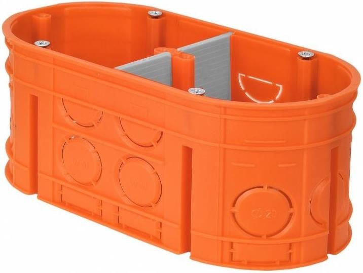 SIMET - Puszka instalacyjna podtynkowa dwupolowa, pomarańczowa Puszka jest wyposażona w 2 wyciągane półprzegrody z osłabieniem w dolnej części do przeprowadzania przewodów i 4 wkręty. Średnica zewnętrzna: 71 mm Głębokość: 63 mm Długość całkowita: 140 mm Rozstaw otworów do mocowania sprzętu: 60 mm Klasa szczelności: IP20