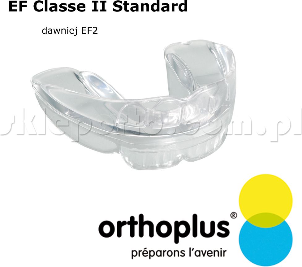 EF Classe II Standard - leczenie interceptywne w przypadku uzębienia mieszanego, dla dzieci w wieku 8 - 11 lat. Aparat charakteryzuje się szerszymi zderzakami wargowymi oraz głębszą zakładką językową. Leczenie aparatem EF Classe II Standard skutecznie wpływa na odblokowanie rozwoju żuchwy oraz ogranicza negatywny wpływ języka, ust i policzków na wczesne uszeregowanie zębów. Aparat doskonale sprawdza się w leczeniu głębokiego zgryzu i trudnych przypadków klasy II (12 do 15 mm) Budowa Zderzaki wargowe stymulują funkcjonowanie dolnej wargi Podwójna szyna zabezpiecza górne i dolne i zęby przed zbyt dużym naciskiem mięśni warg i policzków Zapora językowa wymusza prawidłowe ułożenie języka co korzystnie wypływa na poprzeczny rozwój podniebienia. Wały nagryzowe w odcinku zębów trzonowych wpływają na prawidłowy rozwój wyrostka kłykciowego Aparat należy nosić w każdą noc oraz minimum 2 godziny w ciągu dnia, lub wedle indywidualnych zaleceń lekarza Aparat EF Classe II Standard jest dostępny w 1 rozmiarze w wariantach przezroczystym, czerwonym, żółtym, zielonym i niebieskim.