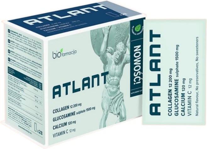 Biofarmacja ATLANT Kompleks kolagenowo-glukozaminowy z dodatkiem wapnia i witaminy C 28 saszetek Biofarmacja ATLANT Kompleks kolagenowo-glukozaminowy z dodatkiem wapnia i witaminy C 28 saszetek Zdrowe kości Funkcjonowanie chrząstki stawowej Praca mięśni Wapń potrzebny do utrzymania zdrowych kości i zębów pomaga w prawidłowym funkcjonowaniu mięśni pomaga w utrzymaniu prawidłowego przekaźnictwa nerwowego Witamina C pomaga w prawidłowej produkcji kolagenu, który jest niezbędny do prawidłowego funkcjonowania chrząstki, kości i skóry Co wyróżnia suplement diety ATLANT na tle preparatów innych firm? 100% NaturalneNatura jest naszą inspiracją. Suplement diety ATLANT to 100% składników pochodzenia naturalnego. Czerpiemy z siły i długowieczności natury! Produkt o najwyższej zawartości kolagenu*12 200 mg kolagenu w 1 saszetce! Kolagen to białko, które jest naturalnie syntetyzowane w organizmie człowieka, nazywane, nie bez powodu, białkiem młodości. Białko to jest składnikiem chrząstki, kości, skóry i stawów. W preparacie obecny jest kolagen typu I i III. Jest on pochodzenia wołowego, gdyż w ten sposób nie ma konieczności dodawania do suplementu sztucznych dodatków neutralizujących smak i zapach ryb. GlukozaminaGlukozamina jest strukturalną częścią chrząstki stawowej. Glukozamina w preparacie ATLANT jest naturalnego pochodzenia morskiego. Pozyskiwana ze skorupiaków z Morza Śródziemnego, w dawce, aż 1500 mg siarczanu glukozaminy na saszetkę.Organiczny wapń z morza martwego Wapń zawarty w preparacie ATLANT to cytrynian wapnia – związek charakteryzujący się dużą przyswajalnością. Pozyskiwany jest ze skał Morza Martwego. Jego organiczne pochodzenie gwarantuje wysoką jakość suplementu. Czysta EtykietaSuplement diety ATLANT ma prosty skład. Zawiera same składniki aktywne w formie proszku, bez dodatków słodzików, wzmacniaczy smaku, barwników, środków zwiększających rozpuszczalność, musujących czy konserwantów. W ten sposób chronimy Twoje zdrowie i środowisko. CertyfikatSuplement diety z opatentowaną formułą i certyfikatami jakościSuplement diety ATLANT został stworzony z myślą o osobach, które potrzebują wsparcia dla stawów, kości, mięśni i skóry. Idealny dla osób intensywnie trenujących, aktywnych oraz tych, których stawy potrzebują regeneracji. *najwyższa zawartość kolagenu w produktach podobnej kategorii na podstawie danych UAB Softdent, według raportu za lato 2018-2020. Składniki Zawartość w 1 saszetce: Hydrolizowany kolagen typu I i III, siarczan glukozaminy (morski, pochodzący ze skorupiaków), cytrynian wapnia, suszone owoce aceroli (łac. Malpighia glabra L.), naturalny aromat, glikozyd stewiolowy. Składniki Zawartość w 1 saszetce RWS* Hydrolizowany kolagen typu I i III 12 200 mg - Siarczan glukozaminy 1500 mg - Jony wapnia 120mg 15% Wyciąg z suszonych owoców aceroli 80 mg - W tym witamina C 12 mg 15% *RWS-Referencyjna wartość spożycia Zalecane spożycie Dorośli: 1 saszetkę dziennie Zawartość saszetki wsypać do szklanki z wodą lub sokiem (ok. 200ml). Mieszać roztwór przez 10-15 minut, dopóki napój nie uzyska solidnej struktury. Zaleca się stosować przez okres do 3 miesięcy. Wskazówka Dlatego zalecamy równomierne rozprowadzenie saszetki cienkim strumieniem i ciągłe mieszanie. Pamiętaj Preparat możesz spożyć posiłkiem lub bez preparat rozpuszczaj w wodzie / soku o temperaturze pokojowej. Unikaj przyjmowania preparatu po posiłku bogatym w szczawiany, a także z dużą ilością tłuszczu. Jeśli chorujesz na niedoczynność tarczycy i przyjmujesz rano leki, preparat przyjmij w drugiej połowie dnia. Przechowywanie Przechowywać w suchym miejscu niedostępnym dla dzieci w temperaturze poniżej 30°C. Chronić przed wilgocią. Ostrzeżenia Zalecana porcja do spożycia niezbędna dla uzyskania korzystnego działania: 1 saszetka. Nie przekraczać zalecanej dziennej porcji. Suplement diety nie może być stosowany jako substytut (zamiennik) zróżnicowanej diety. Dla zdrowia ważna jest zróżnicowana dieta i zdrowy tryb życia. W przypadku kobiet w ciąży, karmiących piersią lub innego, niż zalecane stosowanie, przed zastosowaniem preparatu skonsultuj się z lekarzem lub farmaceutą. Produkt niewskazany dla osób uczulonych na skorupiaki i produkty pochodne (np. siarczan glukozaminy). Producent Gadot Biochemical Industries Ltd, Haifa, Izrael Podmiot odpowiedzialny: Biopharmacia Sp. z o.o.