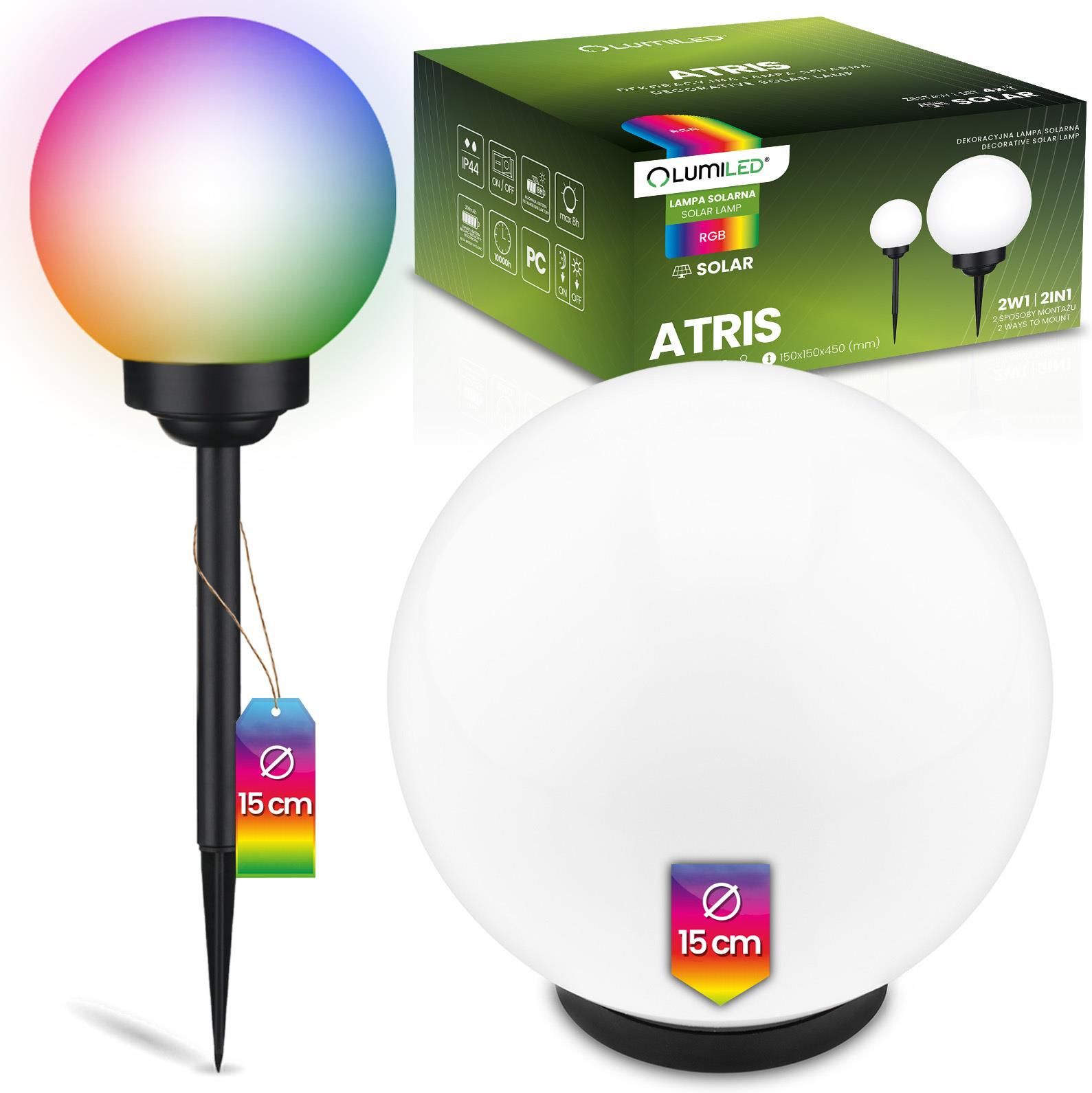 Lampa Solarna Ogrodowa LED ATRIS Wbijana Naziemna Biała Kula 15cm RGB LUMILED Główne cechy produktu Guzikowy akumulator: 1,2V 300mAh Amorficzny panel solarny efektywne ładowanie nawet przy niekorzystnym świetle Czas ładowania lampy: do 6h Czas pracy lampy: do 6h Wbudowany czujnik zmierzchu Duża …